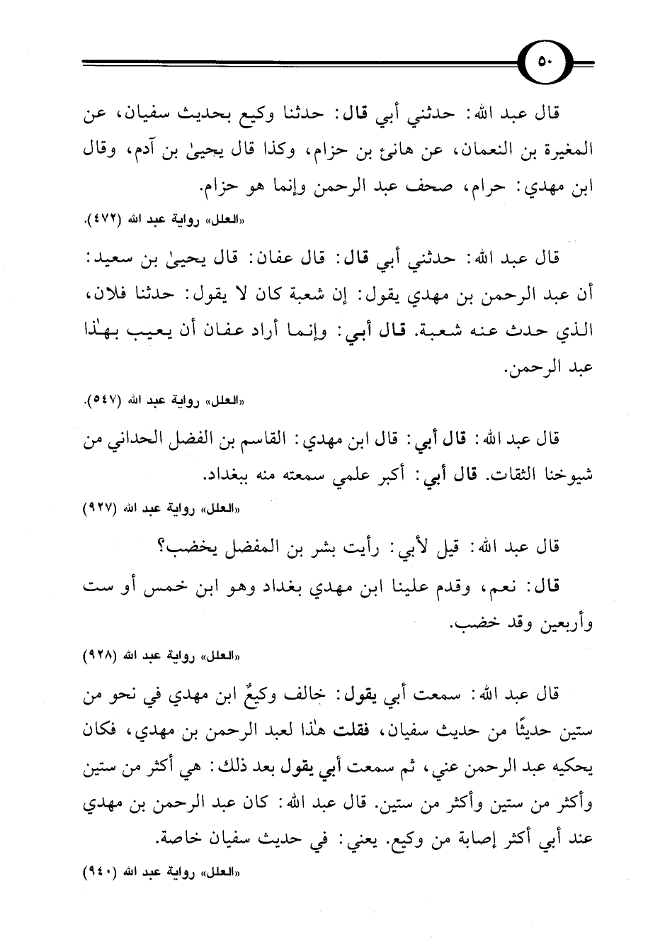 قال عبد اللَّه: سمعت أبي يقول: خالف وكيعٌ ابن مهدي في نحو من ستين حديثًا من حديث سفيان، فقلت هذا لعبد الرحمن بن مهدي، فكان يحكيه عبد الرحمن عني، ثم سمعت أبي يقول بعد ذلك: هي أكثر من ستين وأكثر من ستين وأكثر من ستين. قال عبد اللَّه: كان عبد الرحمن بن مهدي عند أبي أكثر إصابة من وكيع. يعني: في حديث سفيان خاصة.