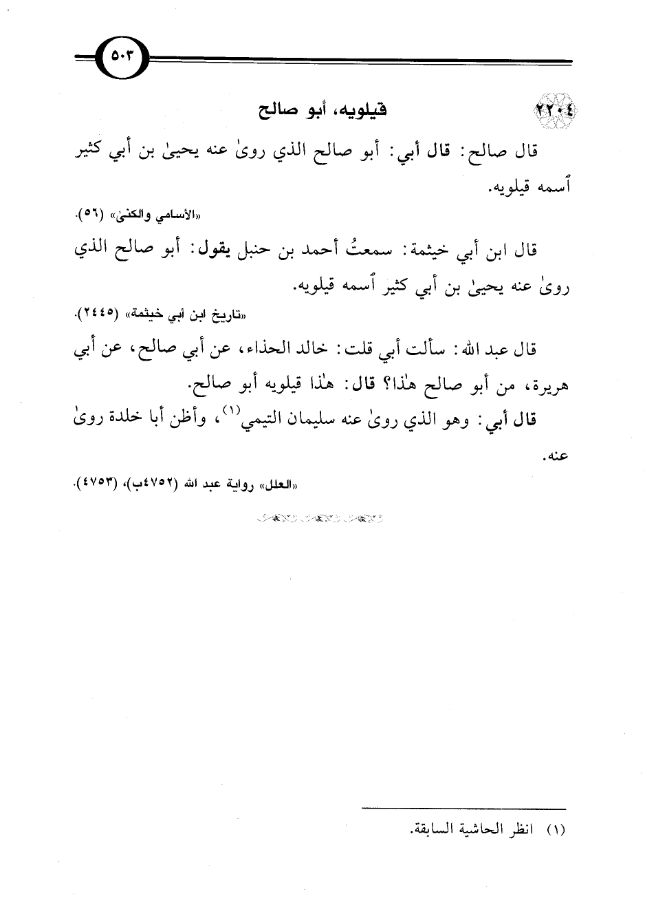 قال عبد اللَّه: سألت أبي قلت: خالد الحذاء، عن أبي صالح، عن أبي هريرة، من أبو صالح هذا؟ قال: هذا قيلويه أبو صالح.