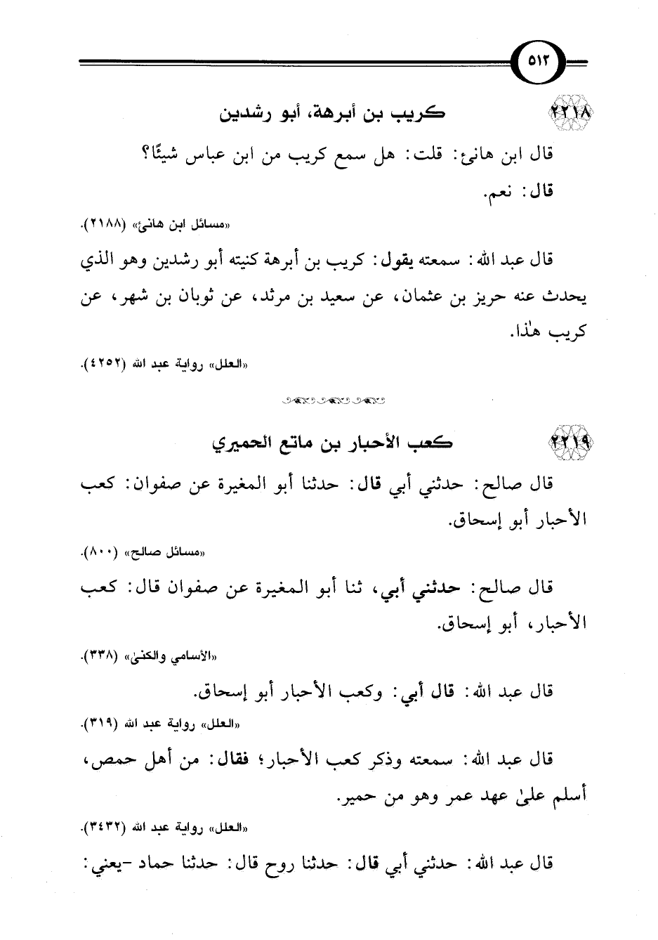 قال صالح: حدثني أبي قال: حدثنا أبو المغيرة عن صفوان: كعب الأحبار أبو إسحاق.