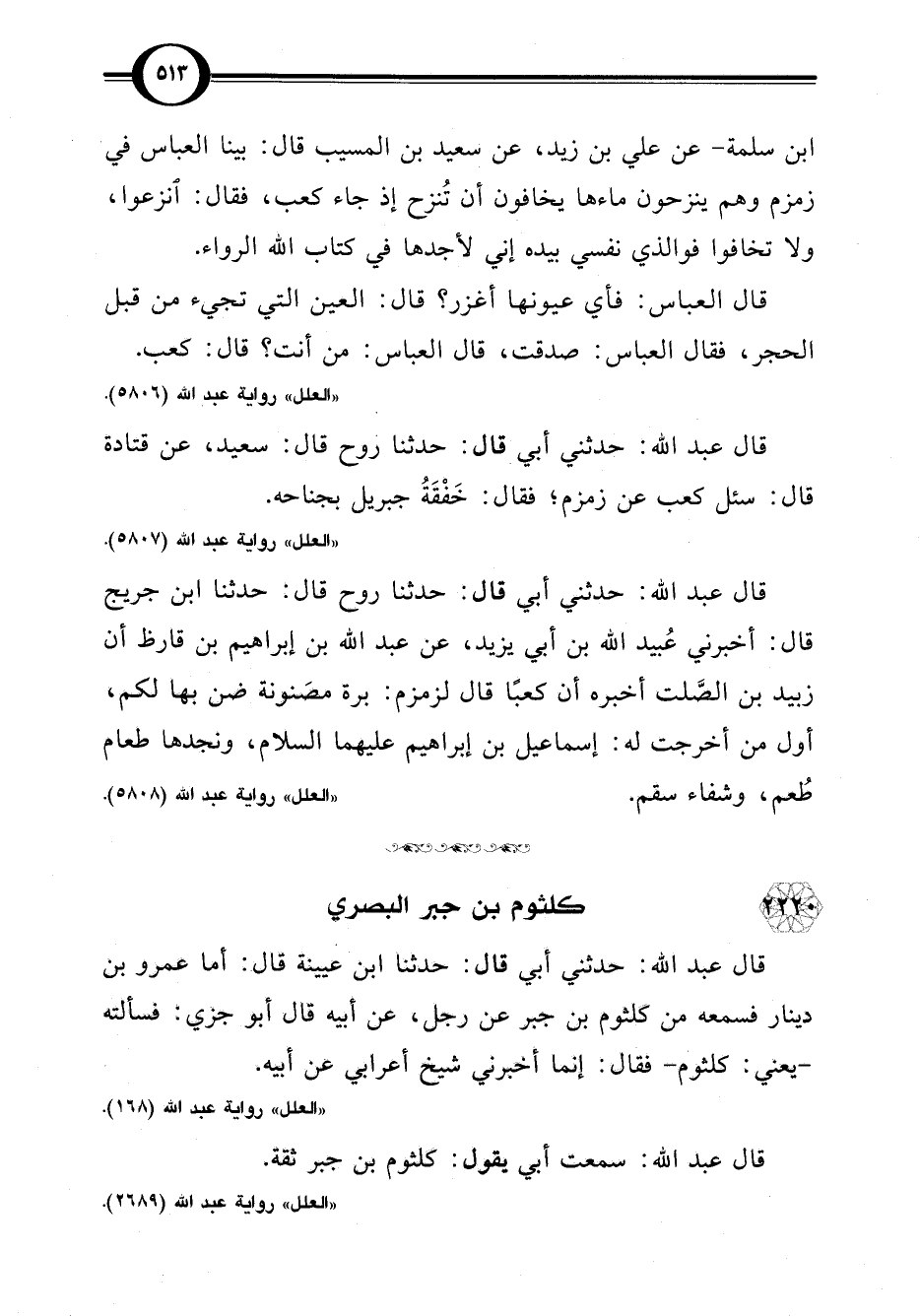 قال عبد اللَّه: حدثني أبي قال: حدثنا روح قال: حدثنا ابن جريج قال: أخبرني عُبيد اللَّه بن أبي يزيد، عن عبد اللَّه بن إبراهيم بن قارظ أن زبيد بن الصَّلت أخبره أن كعبًا قال لزمزم: برة مصَنونة ضن بها لكم، أول من أخرجت له: إسماعيل بن إبراهيم عليهما السلام، ونجدها طعام طُعم، وشفاء سقم.