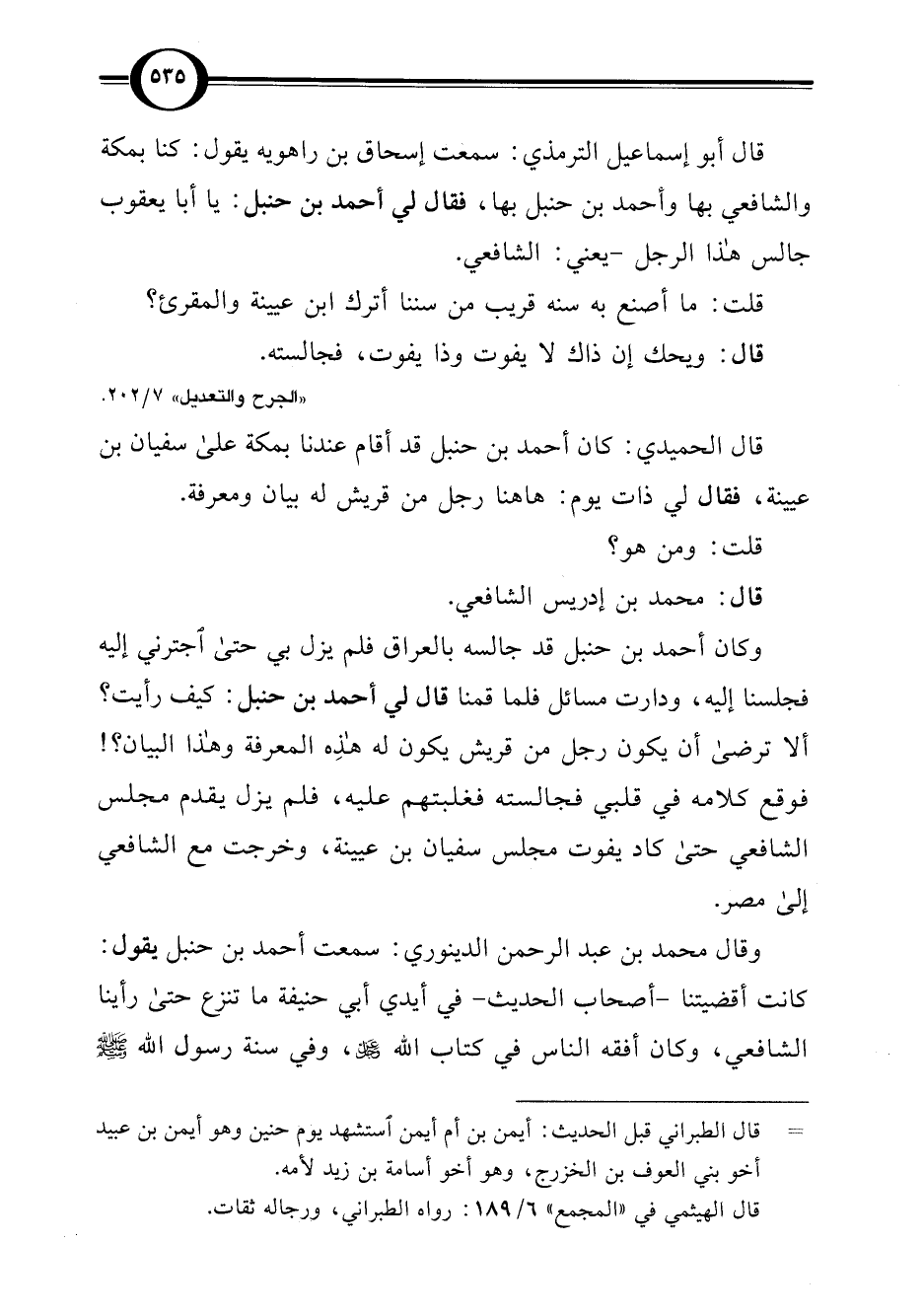 قال أبو إسماعيل الترمذي: سمعت إسحاق بن راهويه يقول: كنا بمكة والشافعي بها وأحمد بن حنبل بها، فقال لي أحمد بن حنبل: يا أبا يعقوب جالس هذا الرجل -يعني: الشافعي.