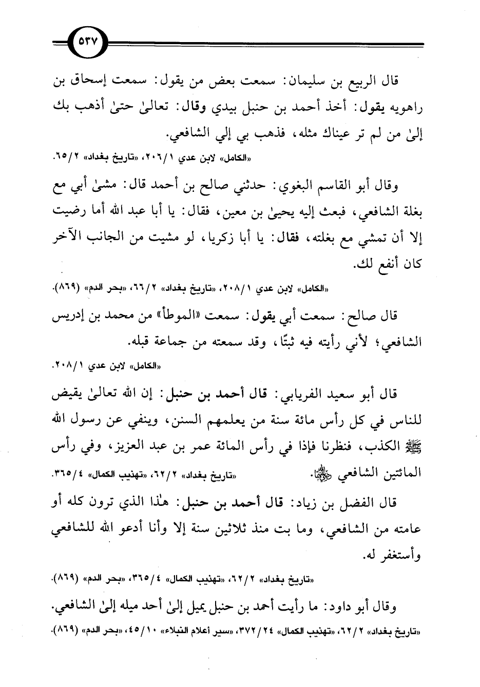 قال أبو سعيد الفريابي: قال أحمد بن حنبل: إن اللَّه تعالى يقيض للناس في كل رأس مائة سنة من يعلمهم السنن، وينفي عن رسول اللَّه -صلى اللَّه عليه وسلم- الكذب، فنظرنا فإذا في رأس المائة عمر بن عبد العزيز، وفي رأس المائتين الشافعي -رضي اللَّه عنهما-.