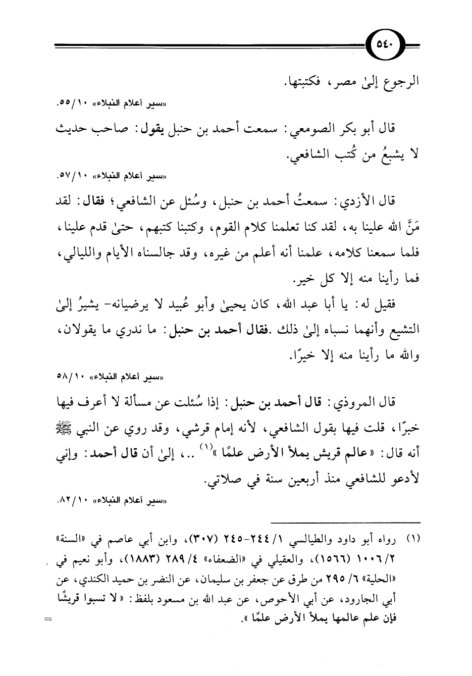قال أبو بكر الصومعي: سمعت أحمد بن حنبل يقول: صاحب حديث لا يشبعُ من كُتب الشافعي.