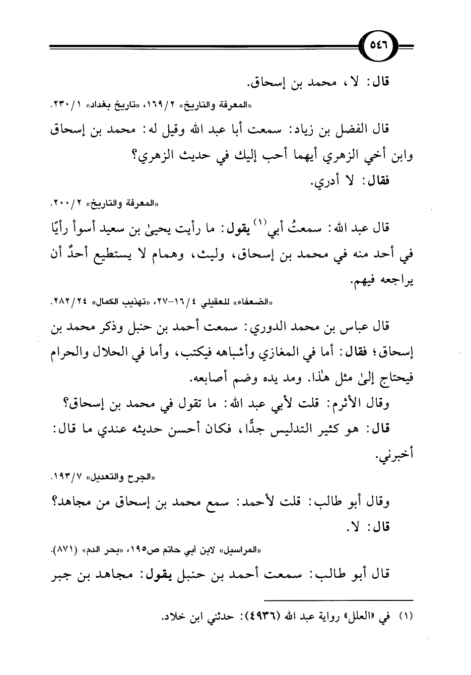 قال عباس بن محمد الدوري: سمعت أحمد بن حنبل وذكر محمد بن إسحاق؛ فقال: أما في المغازي وأشباهه فيكتب، وأما في الحلال والحرام فيحتاج إلى مثل هذا. ومد يده وضم أصابعه.
