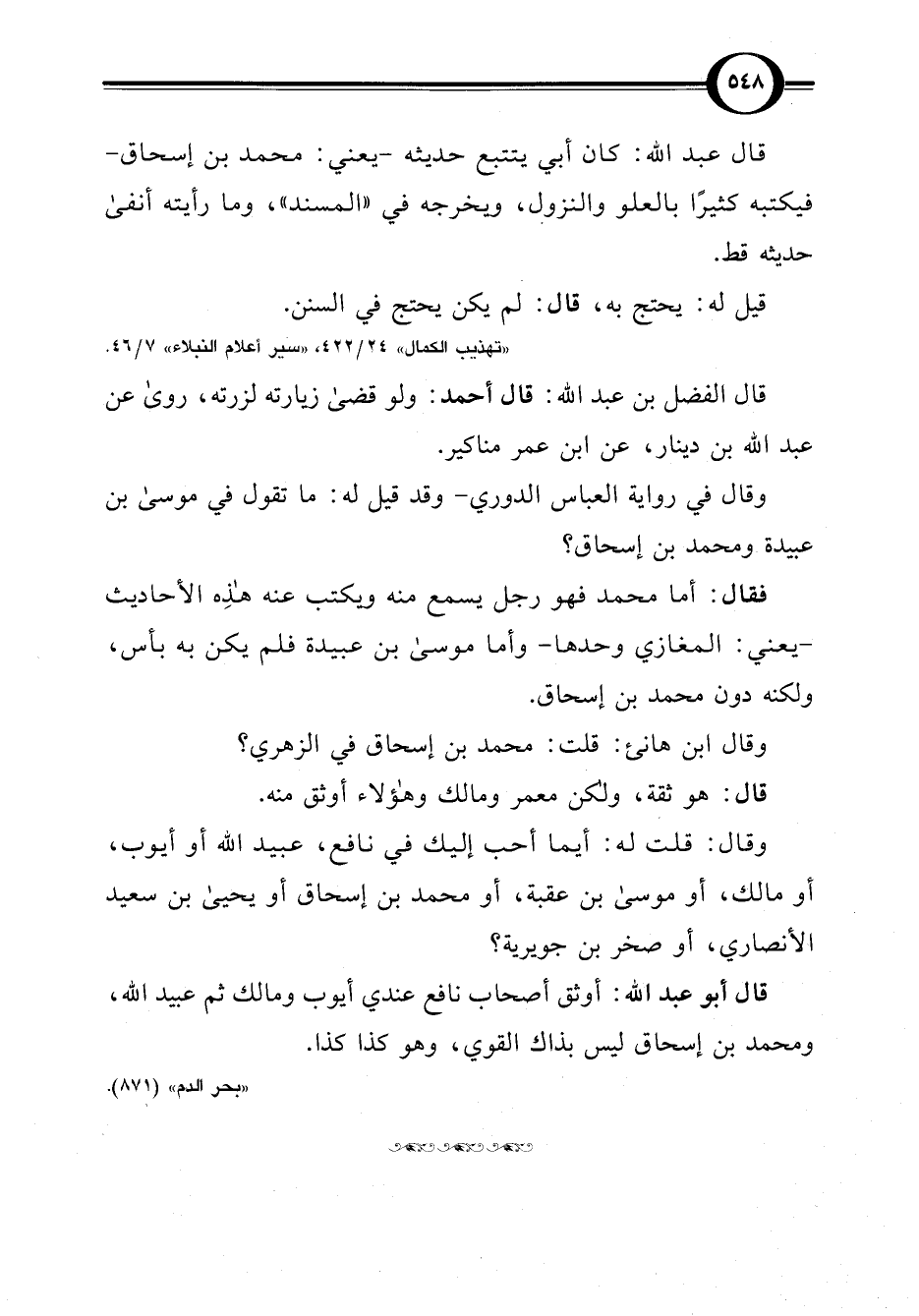 قال عبد اللَّه: كان أبي يتتبع حديثه -يعني: محمد بن إسحاق- فيكتبه كثيرًا بالعلو والنزول، ويخرجه في "المسند"، وما رأيته أنفى حديثه قط.
