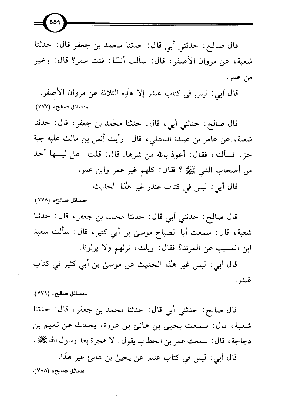 قال صالح: حدثني أبي قال: حدثنا محمد بن جعفر، قال: حدثنا شعبة، قال: سمعت أبا الصباح موسى بن أبي كثير، قال: سألت سعيد ابن المسيب عن المرتد؟ فقال: ويلك، نرثهم ولا يرثونا.