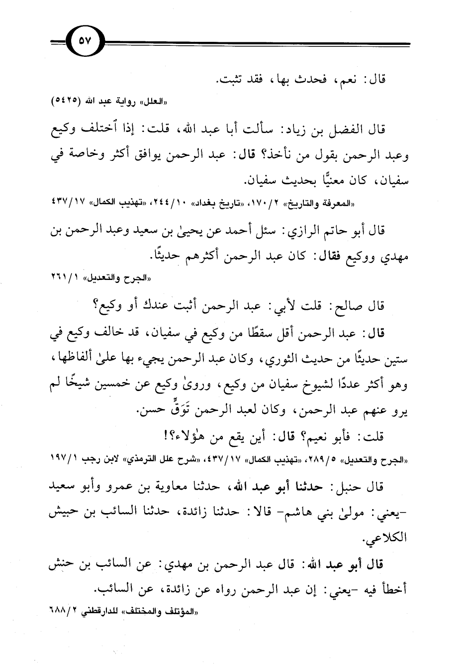 قال الفضل بن زياد: سألت أبا عبد اللَّه، قلت: إذا اختلف وكيع وعبد الرحمن بقول من نأخذ؟ قال: عبد الرحمن يوافق أكثر وخاصة في سفيان، كان معنيًّا بحديث سفيان.