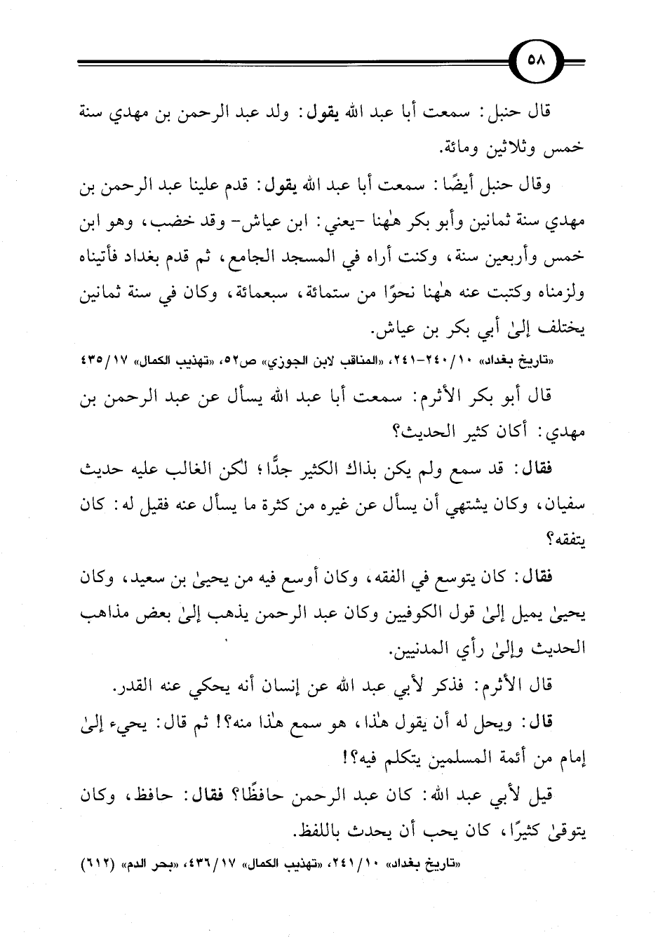 "تاريخ بغداد" 10/ 240 - 241، "المناقب لابن الجوزي" ص 52، "تهذيب الكمال" 17/ 435