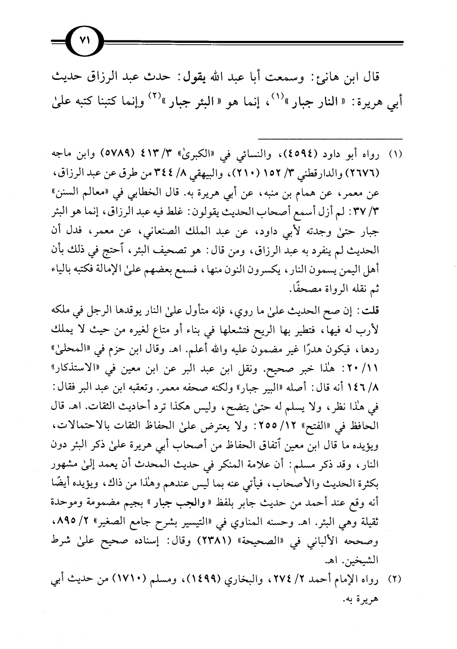 قال ابن هانئ: وسمعت أبا عبد اللَّه يقول: حدث عبد الرزاق حديث أبي هريرة: "النار جبار" (¬1)، إنما هو "البئر جبار" (¬2) وإنما كتبنا كتبه على