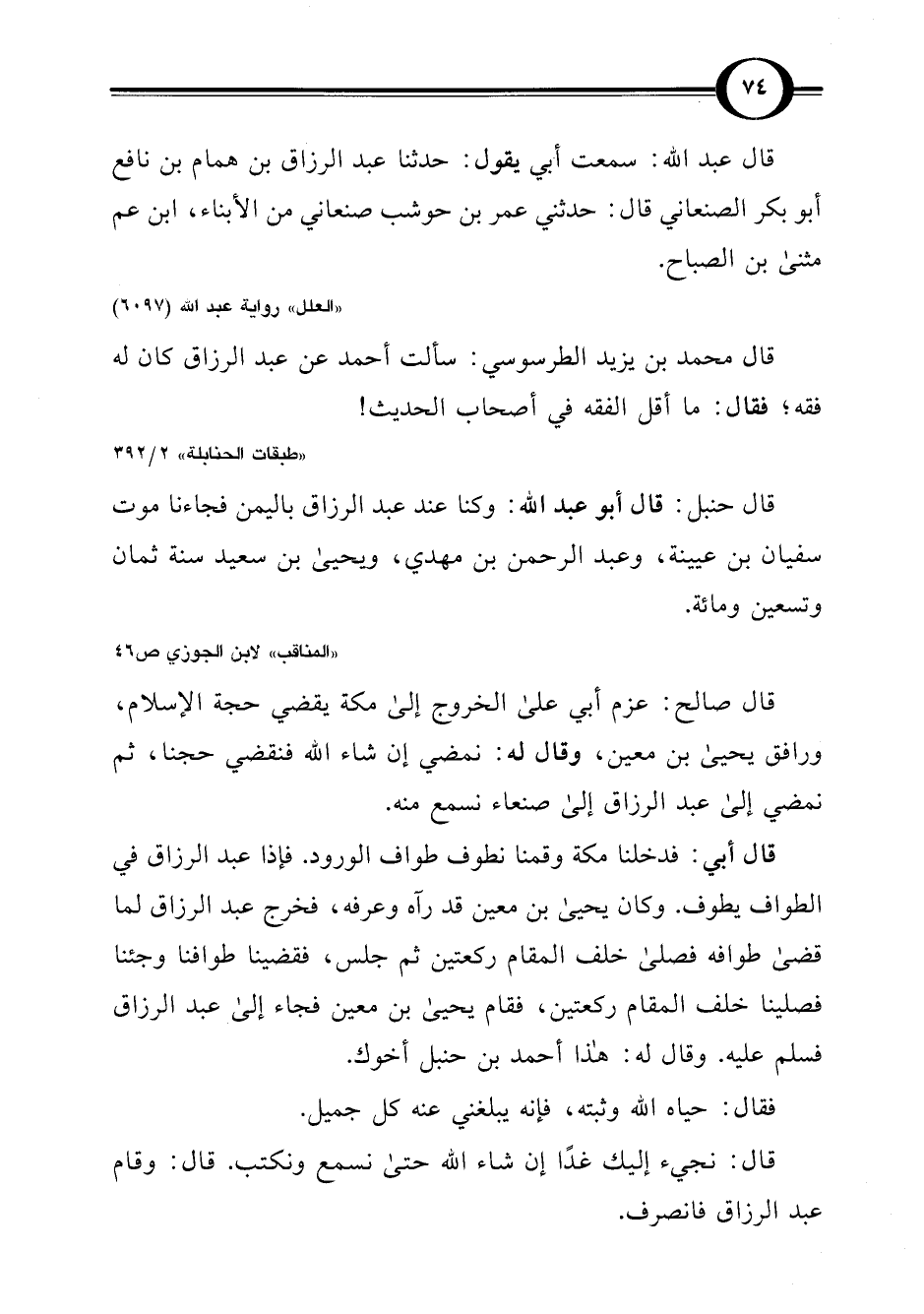 قال أبي: فدخلنا مكة وقمنا نطوف طواف الورود. فإذا عبد الرزاق في الطواف يطوف. وكان يحيى بن معين قد رآه وعرفه، فخرج عبد الرزاق لما قضى طوافه فصلى خلف المقام ركعتين ثم جلس، فقضينا طوافنا وجئنا فصلينا خلف المقام ركعتين، فقام يحيى بن معين فجاء إلى عبد الرزاق فسلم عليه. وقال له: هذا أحمد بن حنبل أخوك.
