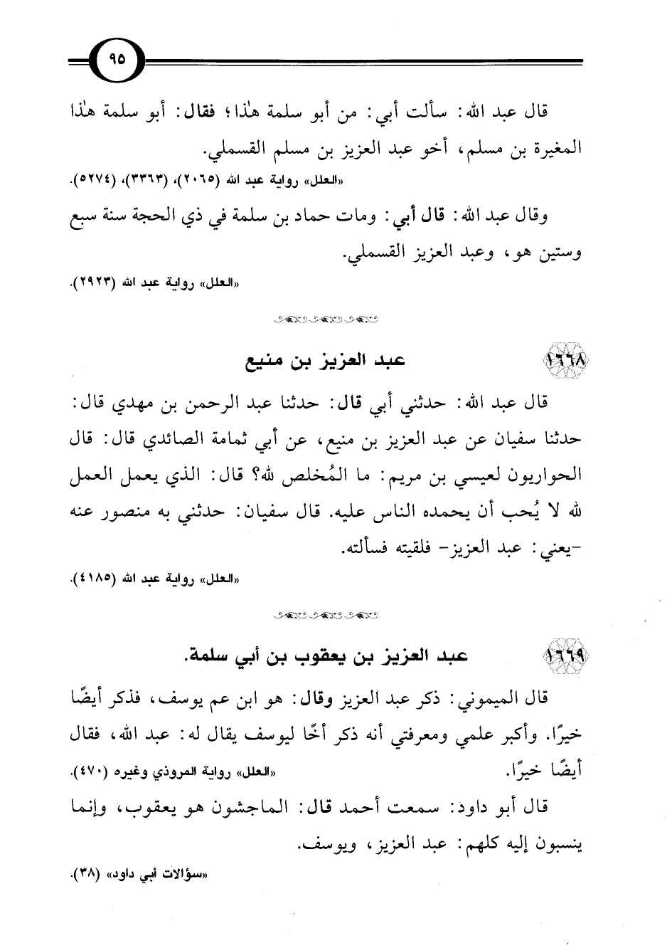 قال عبد اللَّه: سألت أبي: من أبو سلمة هذا؛ فقال: أبو سلمة هذا المغيرة بن مسلم، أخو عبد العزيز بن مسلم القسملي.
