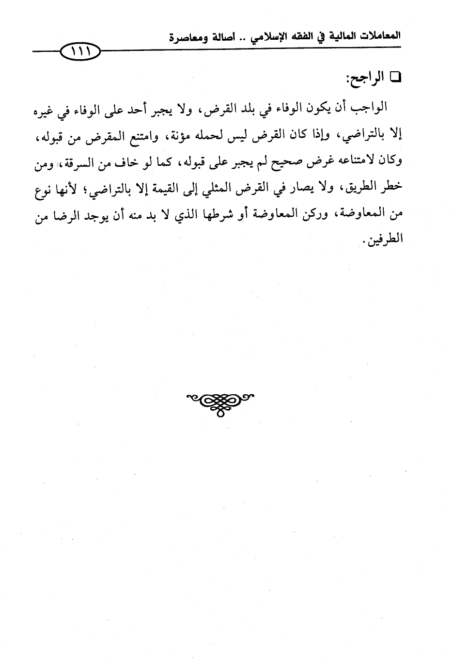 الواجب أن يكون الوفاء في بلد القرض، ولا يجبر أحد على الوفاء في غيره إلا بالتراضي، وإذا كان القرض ليس لحمله مؤنة، وامتنع المقرض من قبوله، وكان لامتناعه غرض صحيح لم يجبر على قبوله، كما لو خاف من السرقة، ومن خطر الطريق، ولا يصار في القرض المثلي إلى القيمة إلا بالتراضي؛ لأنها نوع من المعاوضة، وركن المعاوضة أو شرطها الذي لا بد منه أن يوجد الرضا من الطرفين.
