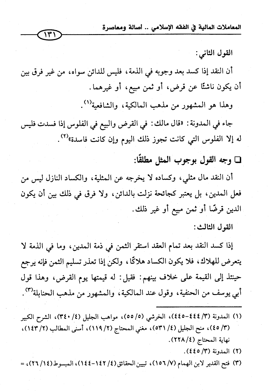جاء في المدونة: "قال مالك: في القرض والبيع في الفلوس إذا فسدت فليس له إلا الفلوس التي كانت تجوز ذلك اليوم وإن كانت فاسدة" (¬٢).