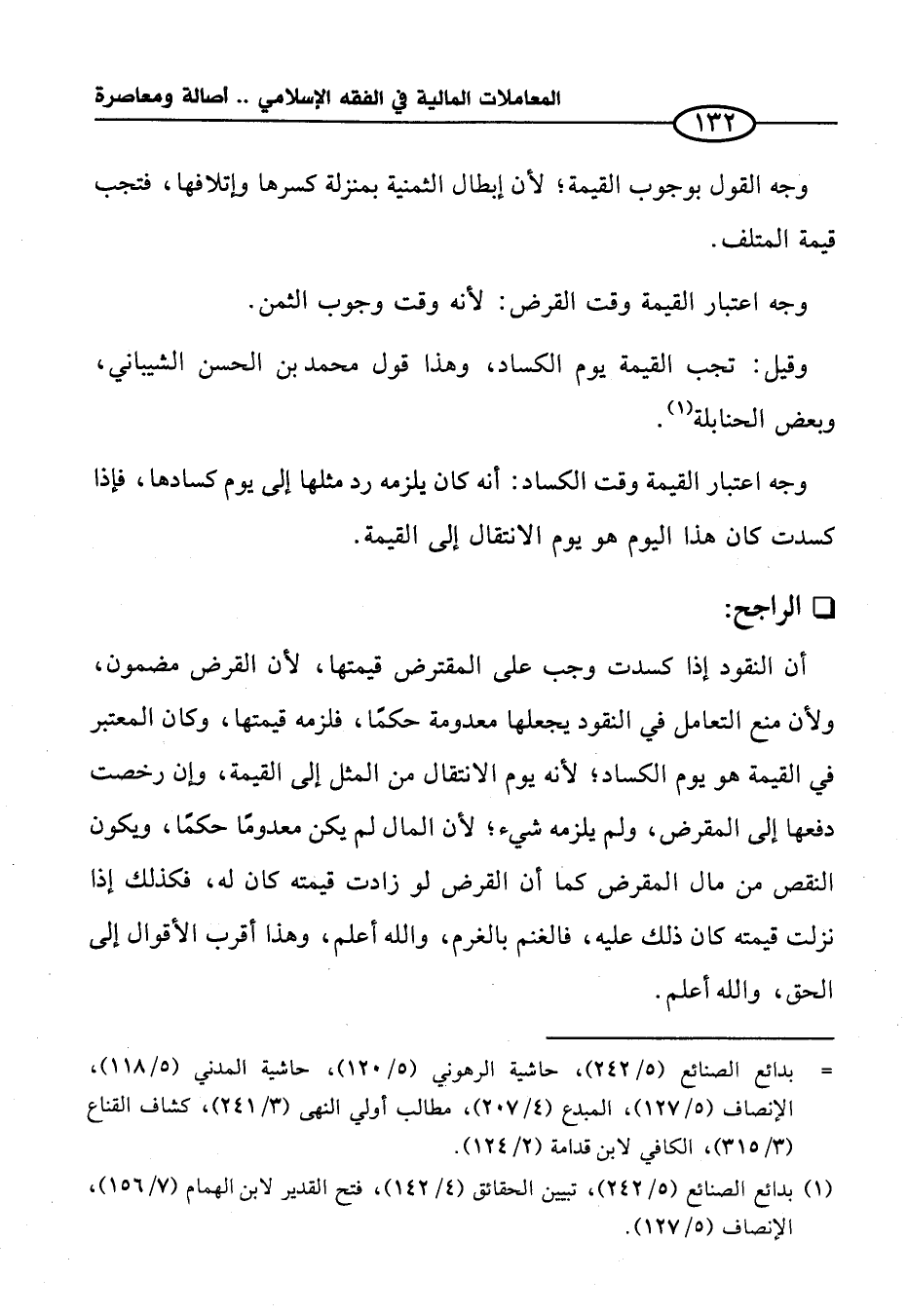 أن النقود إذا كسدت وجب على المقترض قيمتها؛ لأن القرض مضمون، ولأن منع التعامل في النقود يجعلها معدومة حكمًا، فلزمه قيمتها، وكان المعتبر في القيمة هو يوم الكساد؛ لأنه يوم الانتقال من المثل إلى القيمة، وإن رخصت دفعها إلى المقرض، ولم يلزمه شيء؛ لأن المال لم يكن معدومًا حكمًا، ويكون النقص من مال المقرض كما أن القرض لو زادت قيمته كان له، فكذلك إذا نزلت قيمته كان ذلك عليه، فالغنم بالغرم، والله أعلم، وهذا أقرب الأقوال إلى الحق، والله أعلم.