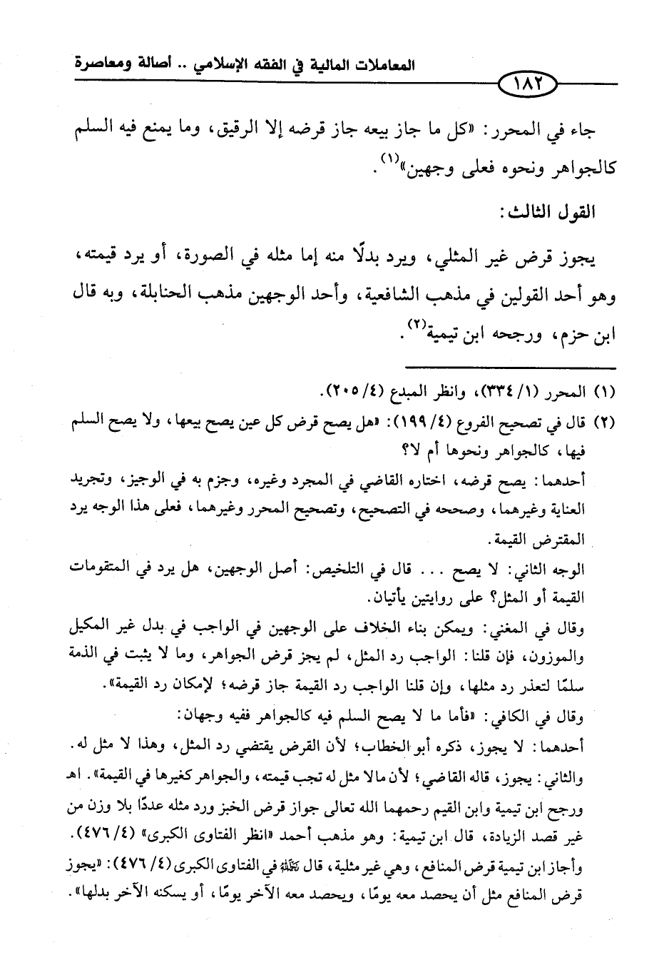 يجوز قرض غير المثلي، ويرد بدلًا منه إما مثله في الصورة، أو يرد قيمته، وهو أحد القولين في مذهب الشافعية، وأحد الوجهين مذهب الحنابلة، وبه قال ابن حزم، ورجحه ابن تيمية (¬٢).