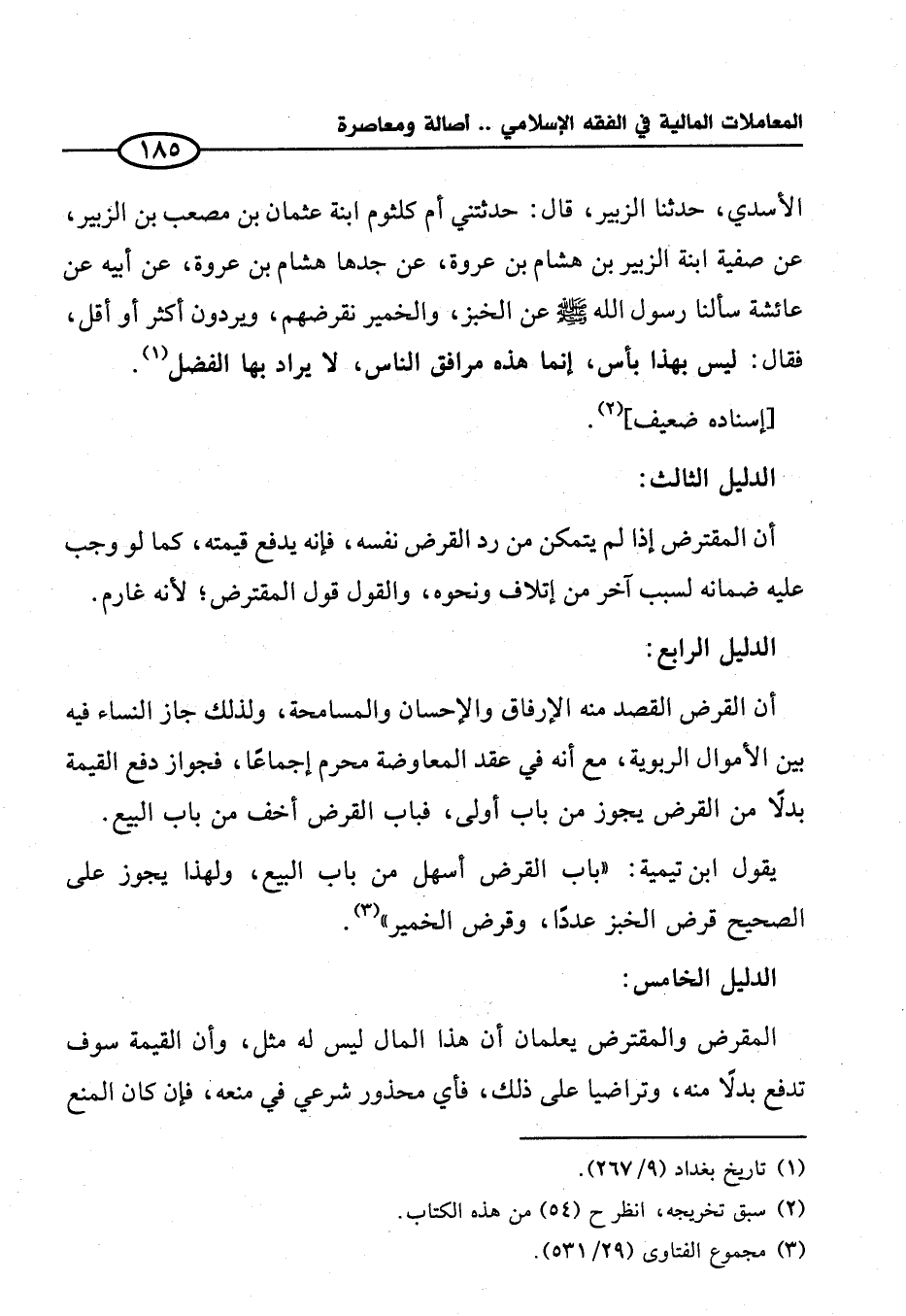 الأسدي، حدثنا الزبير، قال: حدثتني أم كلثوم ابنة عثمان بن مصعب بن الزبير، عن صفية ابنة الزبير بن هشام بن عروة، عن جدها هشام بن عروة، عن أبيه عن عائشة سألنا رسول الله - صلى الله عليه وسلم - عن الخبز، والخمير نقرضهم، ويردون أكثر أو أقل، فقال: ليس بهذا بأس، إنما هذه مرافق الناس، لا يراد بها الفضل (¬١).