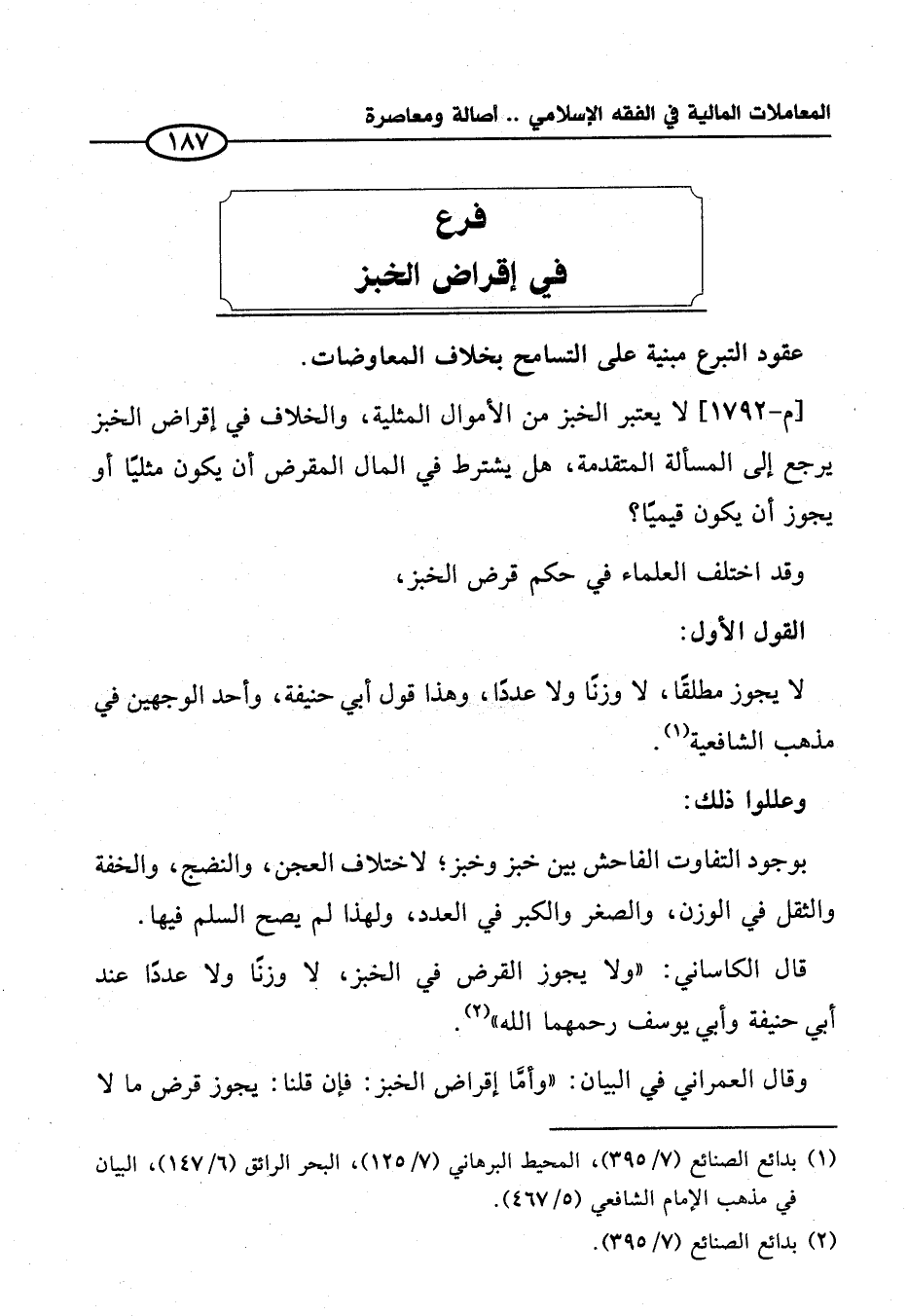 [م - ١٧٩٢] لا يعتبر الخبز من الأموال المثلية، والخلاف في إقراض الخبز يرجع إلى المسألة المتقدمة، هل يشترط في المال المقرض أن يكون مثليًا أو يجوز أن يكون قيميًا؟