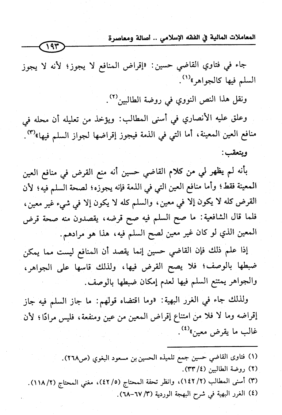 وعلق عليه الأنصاري في أسنى المطالب: ويؤخذ من تعليله أن محله في منافع العين المعينة، أما التي في الذمة فيجوز إقراضها لجواز السلم فيها" (¬٣).
