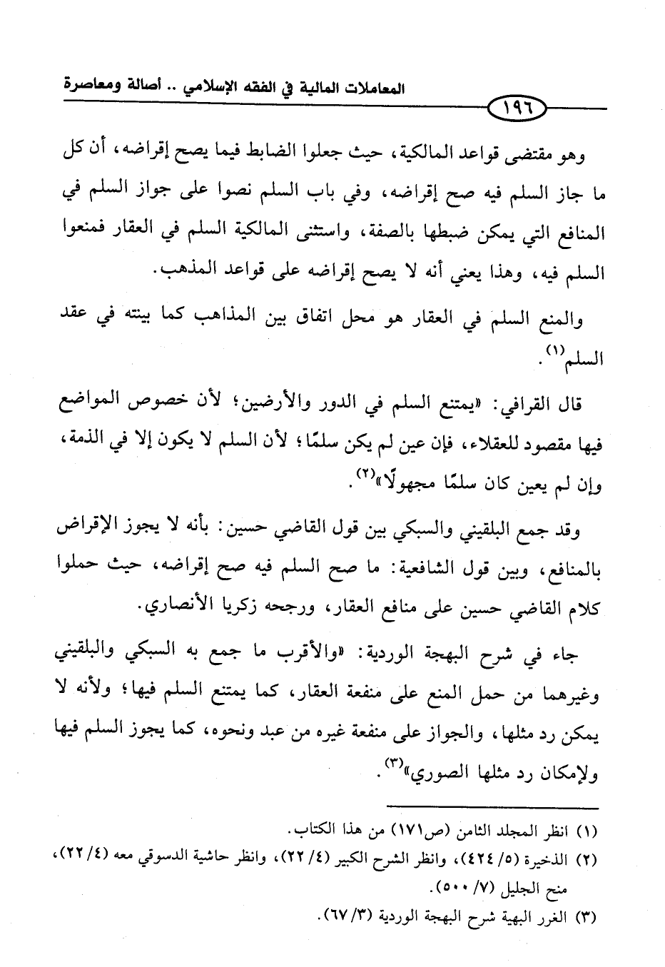 (¬٢) الذخيرة (٥/ ٤٢٤)، وانظر الشرح الكبير (٤/ ٢٢)، وانظر حاشية الدسوقي معه (٤/ ٢٢)، منح الجليل (٧/ ٥٥٠).