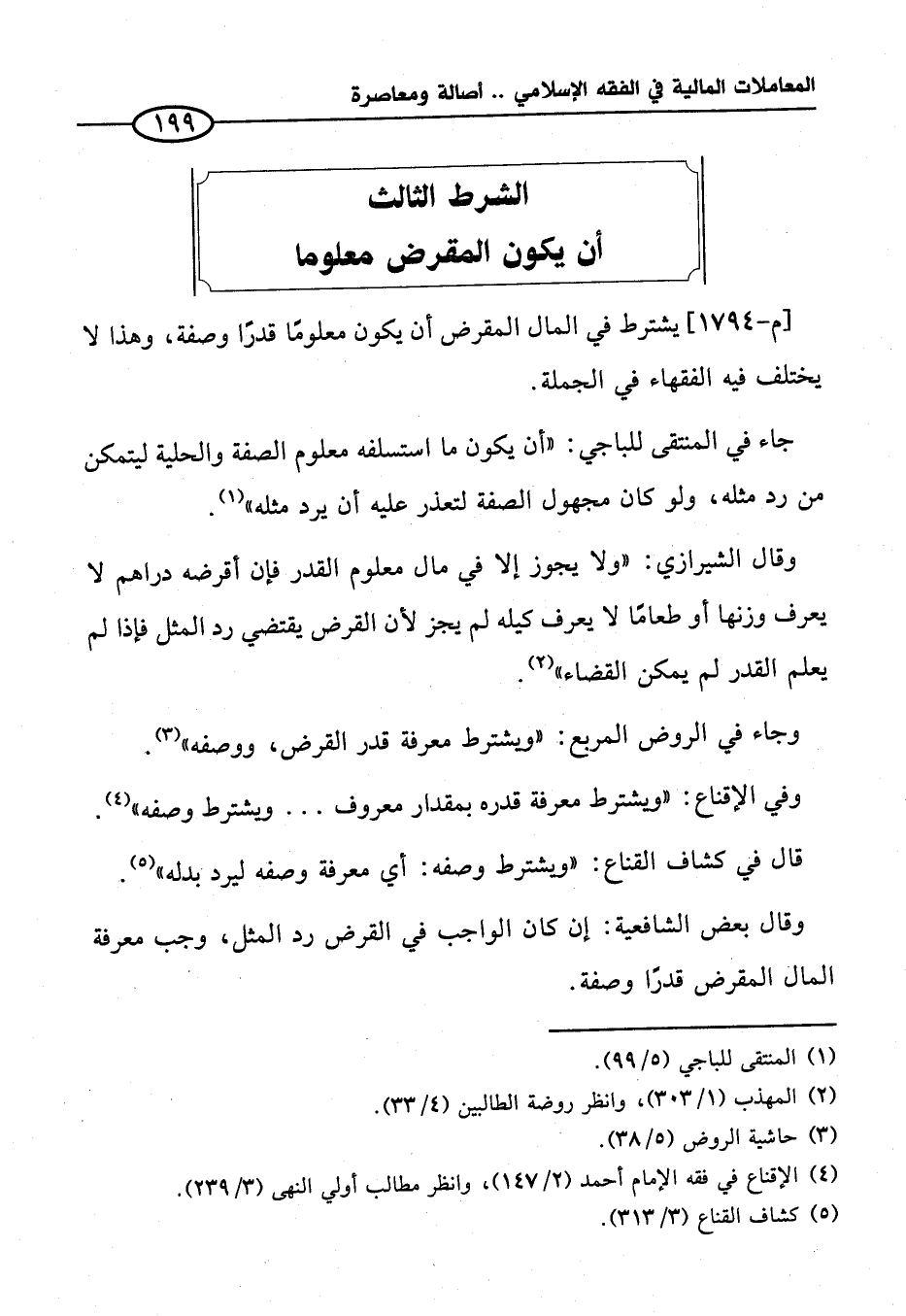 جاء في المنتقى للباجي: "أن يكون ما استسلفه معلوم الصفة والحلية ليتمكن من رد مثله، ولو كان مجهول الصفة لتعذر عليه أن يرد مثله" (¬١).