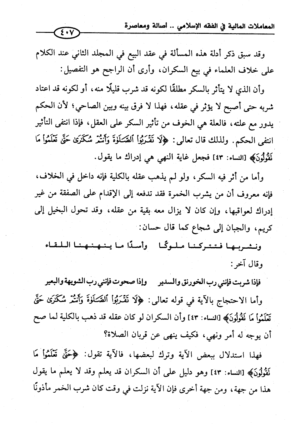 وأن الذي لا يتأثر بالسكر مطلقًا لكونه قد شرب قليلاً منه، أو لكونه قد اعتاد شربه حتى أصبح لا يؤثر في عقله، فهذا لا فرق بينه وبين الصاحي؛ لأن الحكم يدور مع علته، فالعلة هي الخوف من تأثير السكر على العقل، فإذا انتفى التأثير انتفى الحكم. ولذلك قال تعالى: {لَا تَقْرَبُوا الصَّلَاةَ وَأَنْتُمْ سُكَارَى حَتَّى تَعْلَمُوا مَا تَقُولُونَ} [النساء: ٤٣] فجعل غاية النهي هي إدراك ما يقول.