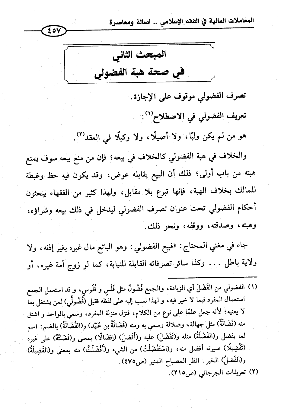 (¬١) الفضولي من الفَضْلَ أي الزيادة، والجمع فُضُولٌ مثل فَلْسٍ وفُلُوسٍ، وقد استعمل الجمع استعمال المفرد فيما لا خير فيه، ولهذا نسب إليه على لفظه فقيل (فُضُوليُّ) لمن يشتغل بما لا يعنيه؛ لأنه جعل علمًا على نوع من الكلام، فنزل منزلة المفرد، وسمي بالواحد واشتق منه (فَضَالَةٌ) مثل جهالة، وضلالة وسمي به ومنه (فَضَالَةُ بن عُبَيْد) و (الفُضَالَةُ) بالضم: اسم لما يفضل و (الفَضْلَةُ) مثله و (تَفَضّلَ) عليه و (أفَضلَ) (إفضَالًا) بمعنى و (فَضلتُهُ) على غيره (تَفْضِيلًا) صيرته أفضل منه، و (اسْتَفْضَلْتُ) من الشيء و (أَفْضَلْتُ) منه بمعنى و (الفَضِيلَةُ) و (الفَضلُ) الخير. انظر المصباح المنير (ص ٤٧٥).