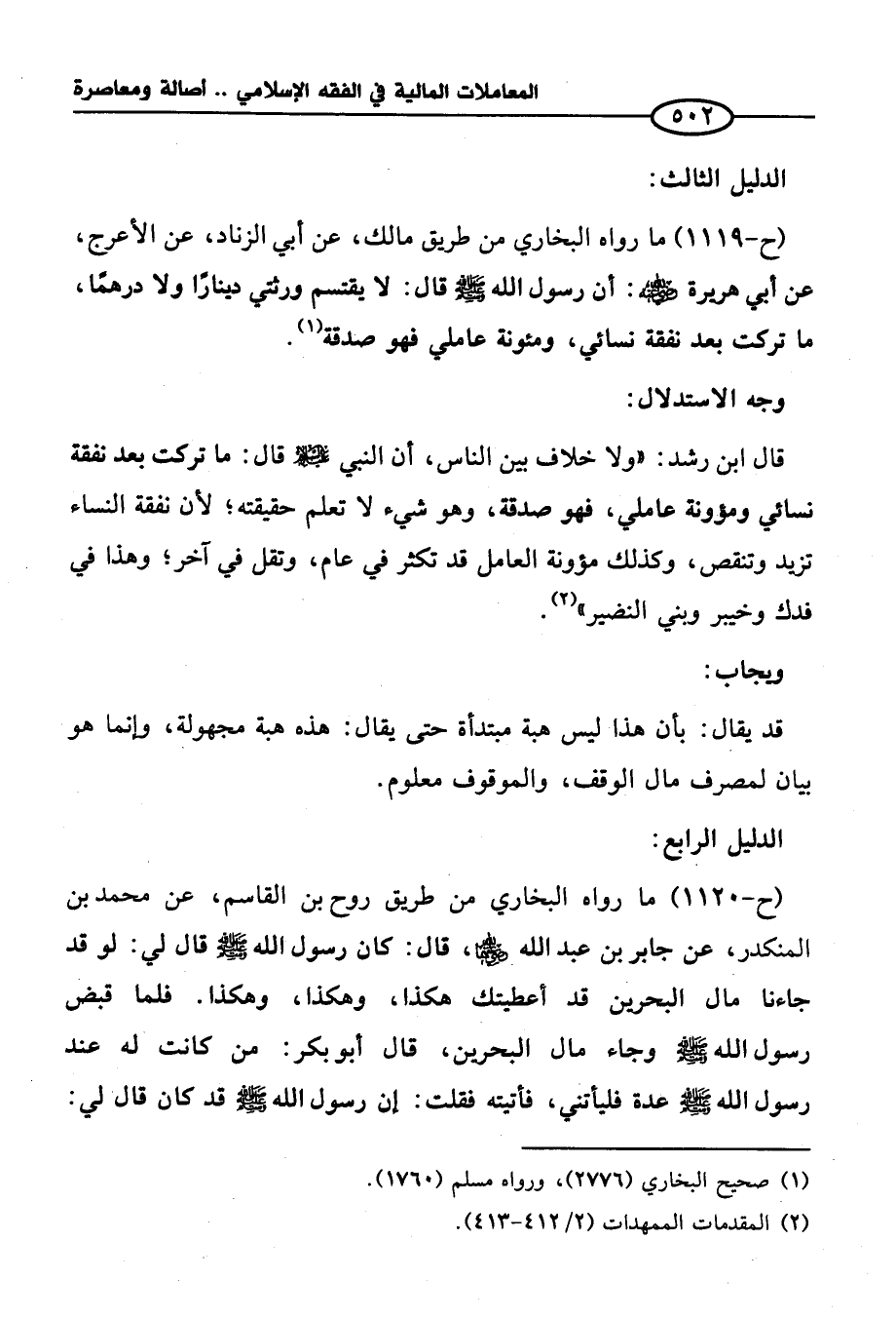 (ح -١١١٩) ما رواه البخاري من طريق مالك، عن أبي الزناد، عن الأعرج، عن أبي هريرة - رضي الله عنه -: أن رسول الله - صلى الله عليه وسلم - قال: لا يقتسم ورثتي دينارًا ولا درهمًا، ما تركت بعد نفقة نسائي، ومئونة عاملي فهو صدقة (¬١).
