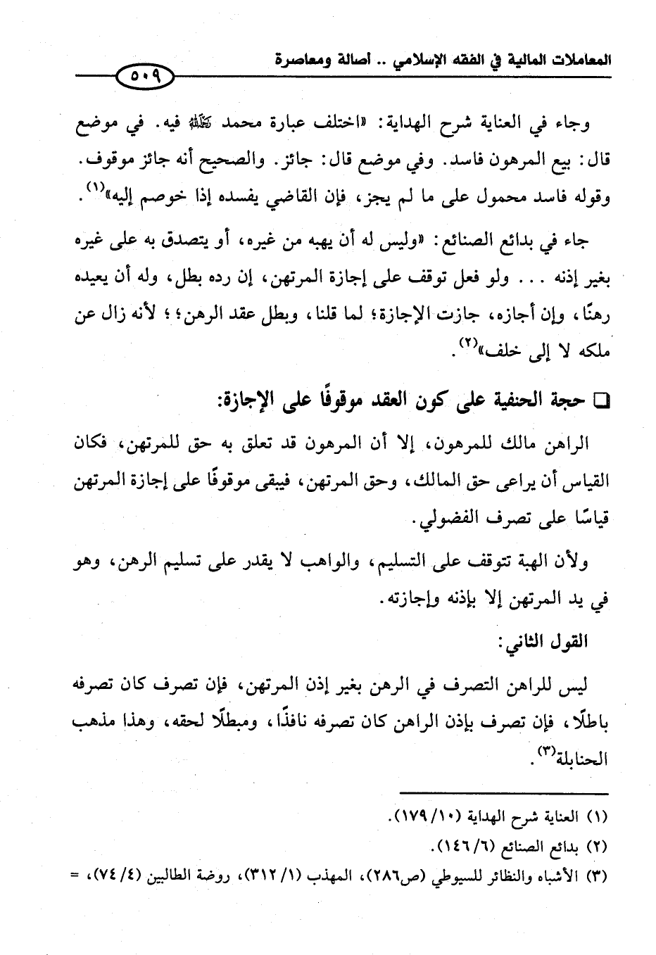 وجاء في العناية شرح الهداية: "اختلف عبارة محمَّد - رحمه الله - فيه. في موضع قال: بيع المرهون فاسد. وفي موضع قال: جائز. والصحيح أنه جائز موقوف. وقوله فاسد محمول على ما لم يجز، فإن القاضي يفسده إذا خوصم إليه" (¬١).