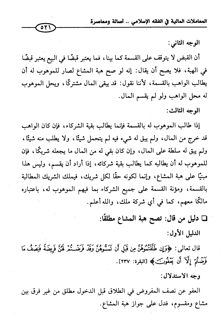أن القبض لا يتوقف على القسمة كما بينا، فما يعتبر قبضًا في البيع يعتبر قبضًا في الهبة، فلا يصح أن يقال: إنه لو صح هبة المشاع لصار للموهوب له أن يطالب الواهب بالقسمة؛ لأننا نقول: قد يبقى المال مشتركًا، ويحل الموهوب له محل الواهب ولو لم يقسم المال.