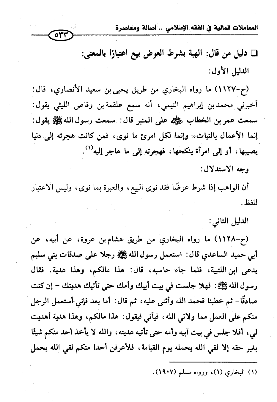 (ح-١١٢٧) ما رواه البخاري من طريق يحيى بن سعيد الأنصاري، قال: أخبرني محمد بن إبراهيم التيمي، أنه سمع علقمة بن وقاص الليثي يقول: سمعت عمر بن الخطاب - رضي الله عنه - على المنبر قال: سمعت رسول الله - صلى الله عليه وسلم - يقول: إنما الأعمال بالنيات، وإنما لكل امرئ ما نوى، فمن كانت هجرته إلى دنيا يصيبها، أو إلى امرأة ينكحها، فهجرته إلى ما هاجر إليه (¬١).