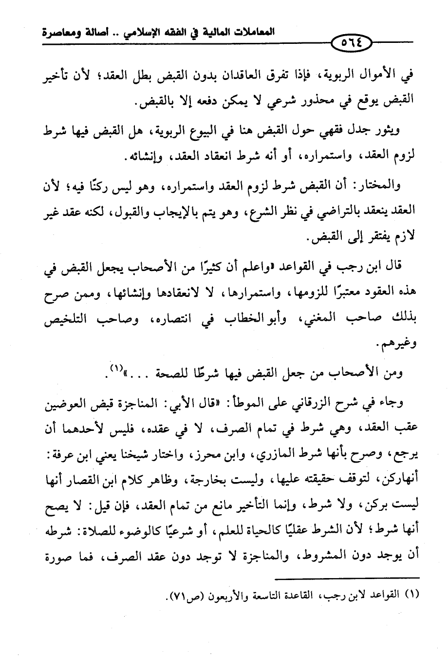 قال ابن رجب في القواعد "واعلم أن كثيرًا من الأصحاب يجعل القبض في هذه العقود معتبرًا للزومها، واستمرارها، لا لانعقادها وإنشائها، وممن صرح بذلك صاحب المغني، وأبو الخطاب في انتصاره، وصاحب التلخيص وغيرهم.