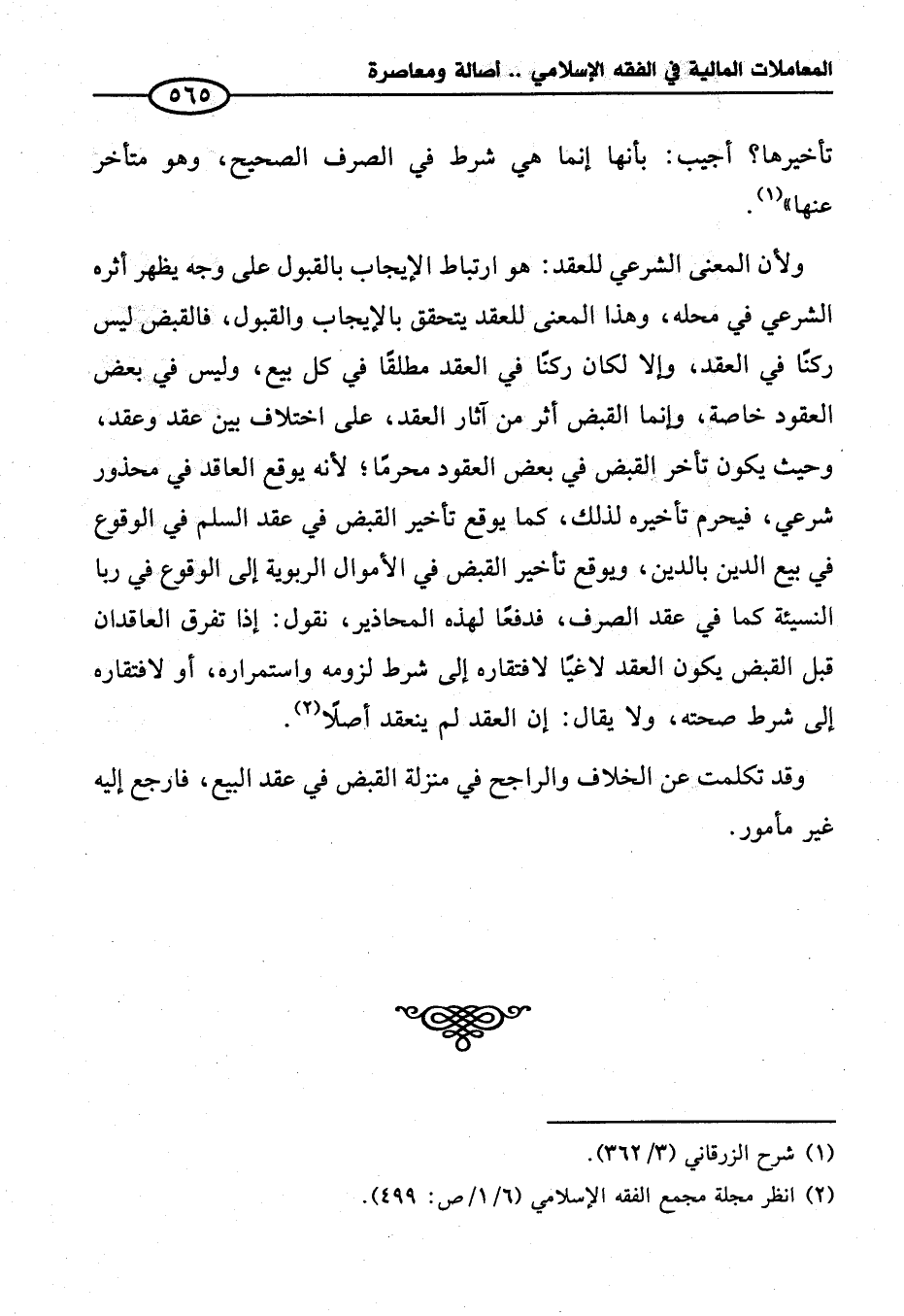 ولأن المعنى الشرعي للعقد: هو ارتباط الإيجاب بالقبول على وجه يظهر أثره الشرعي في محله، وهذا المعنى للعقد يتحقق بالإيجاب والقبول، فالقبض ليس ركنًا في العقد، وإلا لكان ركنًا في العقد مطلقًا في كل بيع، وليس في بعض العقود خاصة، وإنما القبض أثر من آثار العقد، على اختلاف بين عقد وعقد، وحيث يكون تأخر القبض في بعض العقود محرمًا؛ لأنه يوقع العاقد في محذور شرعي، فيحرم تأخيره لذلك، كما يوقع تأخير القبض في عقد السلم في الوقوع في بيع الدين بالدين، ويوقع تأخير القبض في الأموال الربوية إلى الوقوع في ربا النسيئة كما في عقد الصرف، فدفعًا لهذه المحاذير، نقول: إذا تفرق العاقدان قبل القبض يكون العقد لاغيًا لافتقاره إلى شرط لزومه واستمراره، أو لافتقاره إلى شرط صحته، ولا يقال: إن العقد لم ينعقد أصلًا (¬٢).