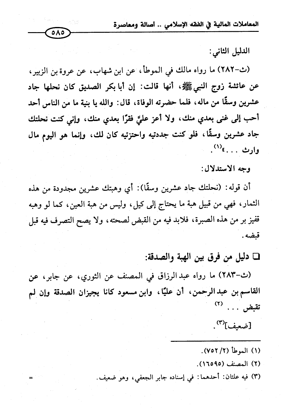 (ث-٢٨٢) ما رواه مالك في الموطأ، عن ابن شهاب، عن عروة بن الزبير، عن عائشة زوج النبي - صلى الله عليه وسلم -، أنها قالت: إن أبا بكر الصديق كان نحلها جاد عشرين وسقًا من ماله، فلما حضرته الوفاة، قال: والله يا بنية ما من الناس أحد أحب إلى غنى بعدي منك، ولا أعز عليَّ فقرًا بعدي منك، وإني كنت نحلتك جاد عشرين وسقًا، فلو كنت جددتيه واحتزتيه كان لك، وإنما هو اليوم مال وارث ... " (¬١).