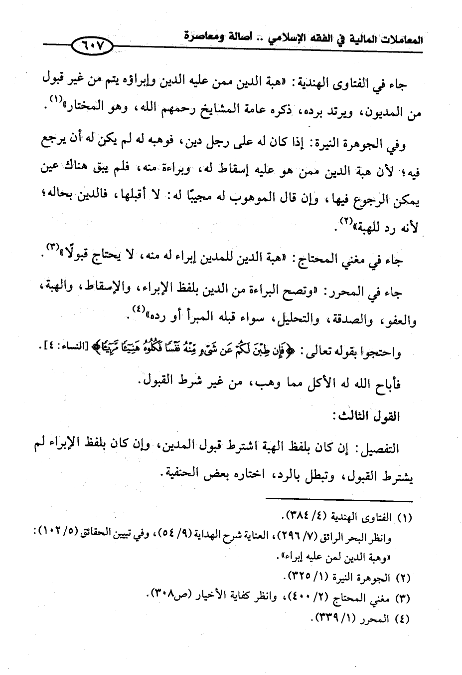 جاء في مغني المحتاج: "هبة الدين للمدين إبراء له منه، لا يحتاج قبولًا" (¬٣).