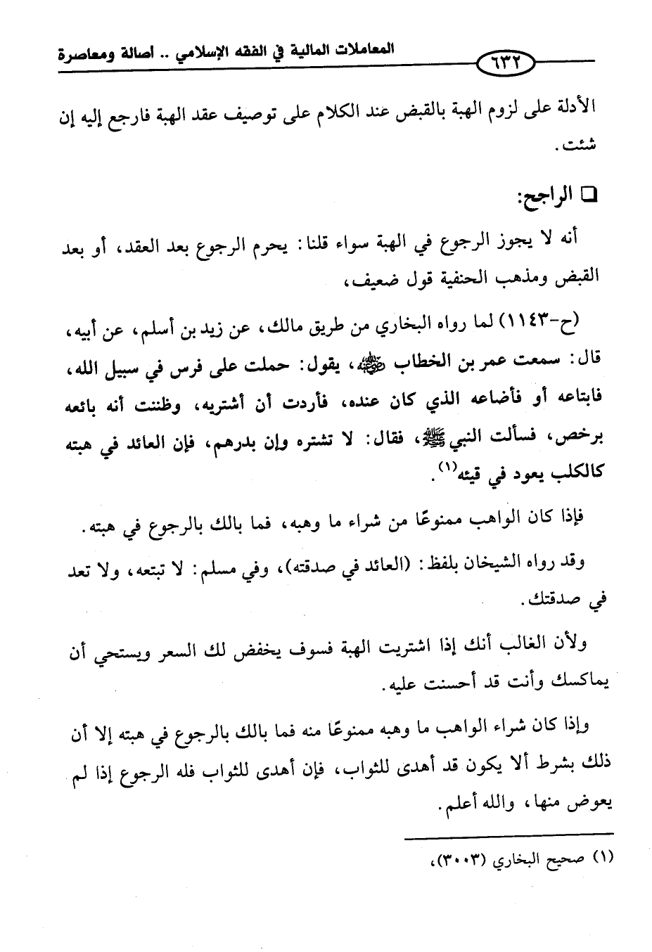 (ح-١١٤٣) لما رواه البخاري من طريق مالك، عن زيد بن أسلم، عن أبيه، قال: سمعت عمر بن الخطاب - رضي الله عنه -، يقول: حملت على فرس في سبيل الله، فابتاعه أو فأضاعه الذي كان عنده، فأردت أن أشتريه، وظننت أنه بائعه برخص، فسألت النبي - صلى الله عليه وسلم -، فقال: لا تشتره وإن بدرهم، فإن العائد في هبته كالكلب يعود في قيئه (¬١).