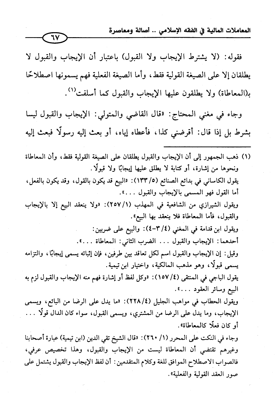 وجاء في النكت على المحرر (١/ ٢٦٠): "قال الشيخ تقي الدين (ابن تيمية) عبارة أصحابنا وغيرهم تقتضي أن المعاطاة ليست من الإيجاب والقبول، وهذا تخصيص عرفي، فالصواب الاصطلاح الموافق للغة وكلام المتقدمين: أن لفظ الإيجاب والقبول يشتمل على صور العقد القولية والفعلية".