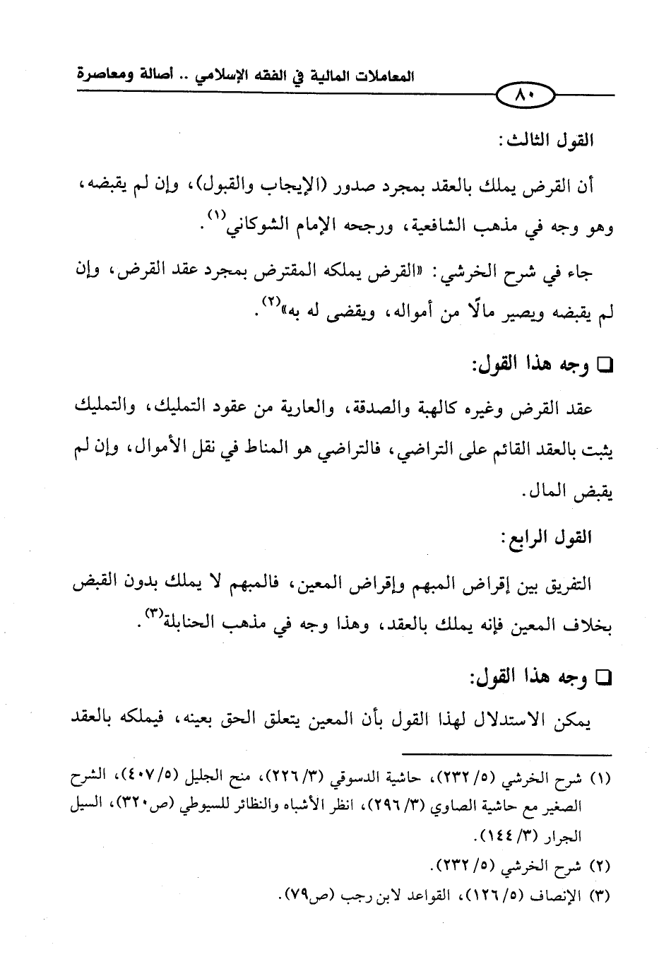 جاء في شرح الخرشي: "القرض يملكه المقترض بمجرد عقد القرض، وإن لم يقبضه ويصير مالًا من أمواله، ويقضى له به" (¬٢).