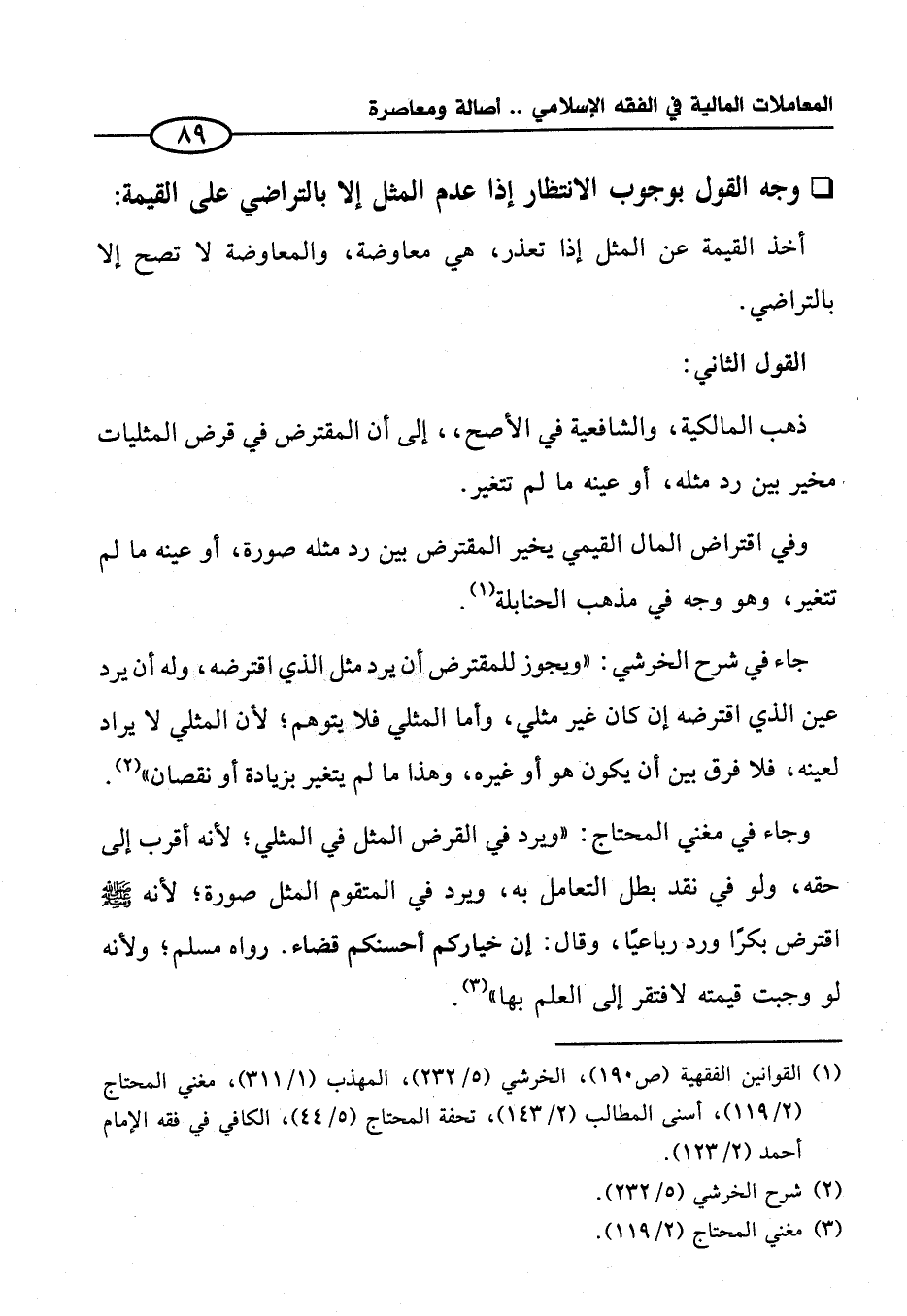 وفي اقتراض المال القيمي يخير المقترض بين رد مثله صورة، أو عينه ما لم تتغير، وهو وجه في مذهب الحنابلة (¬١).