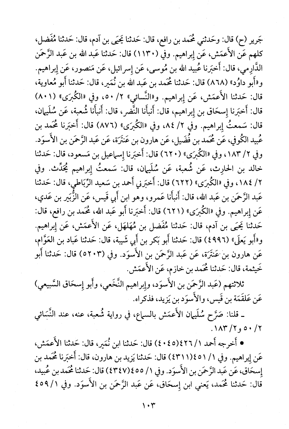 وفي ٢/ ١٨٣، وفي «الكبرى» (٦٢٠) قال: أخبرنا إسماعيل بن مسعود، قال: حدثنا خالد بن الحارث، عن شعبة، عن سليمان، قال: سمعت إبراهيم يحدث. وفي ٢/ ١٨٤، وفي «الكبرى» (٦٢٢) قال: أخبرني أحمد بن سعيد الرباطي، قال: حدثنا عبد الرَّحمَن بن عبد الله، قال: أنبأنا عَمرو، وهو ابن أبي قيس، عن الزبير بن عَدي، عن إبراهيم. وفي «الكبرى» (٦٢١) قال: أخبرنا أَبو عبد الله، محمد بن رافع، قال: حدثنا يحيى بن آدم، قال: حدثنا مفضل بن مهلهل، عن الأعمش، عن إبراهيم. و «أَبو يَعلى» (٤٩٩٦) قال: حدثنا أَبو بكر بن أبي شيبة، قال: حدثنا عباد بن العوام، عن هارون بن عنترة، عن عبد الرَّحمَن بن الأسود. وفي (٥٢٠٣) قال: حدثنا أَبو خيثمة، قال: حدثنا محمد بن خازم، عن الأعمش، عن إِبراهيم.