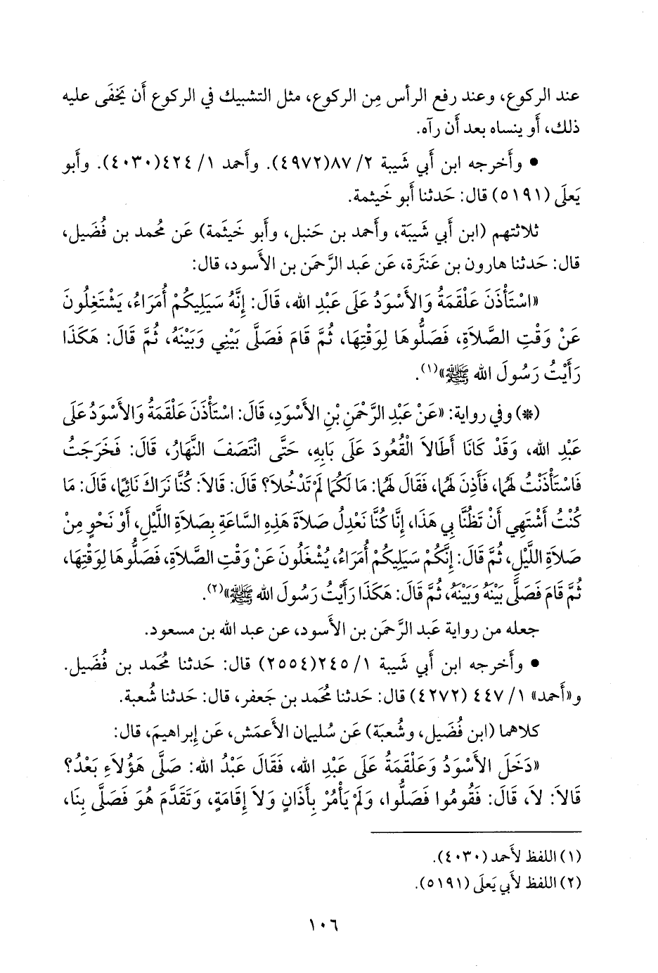 فذهبنا نتأخر، فأخذ بأيدينا، فأقامنا معه، فلما ركعنا وضع الأسود يديه على ركبتيه، فنظر عبد الله فأبصره، فضرب يده، فنظر الأسود، فإذا يدا عبد الله بين ركبتيه، وقد خالف بين أصابعه، فلما قضى الصلاة، قال: إذا كنتم ثلاثة، فليؤمكم أحدكم، وإذا ركعت فأفرش ذراعيك فخذيك، فكأني أنظر إلى اختلاف أصابع النبي صَلى الله عَليه وسَلم وهو راكع، ثم قال: إنه سيكون أمراء يميتون الصلاة، شرق الموتى، وإنها صلاة من هو شر من حمار، وصلاة من لا يجد بدا، فمن أدرك ذلك منكم، فليصل الصلاة لميقاتها، ولتكن صلاتكم معهم سبحة».