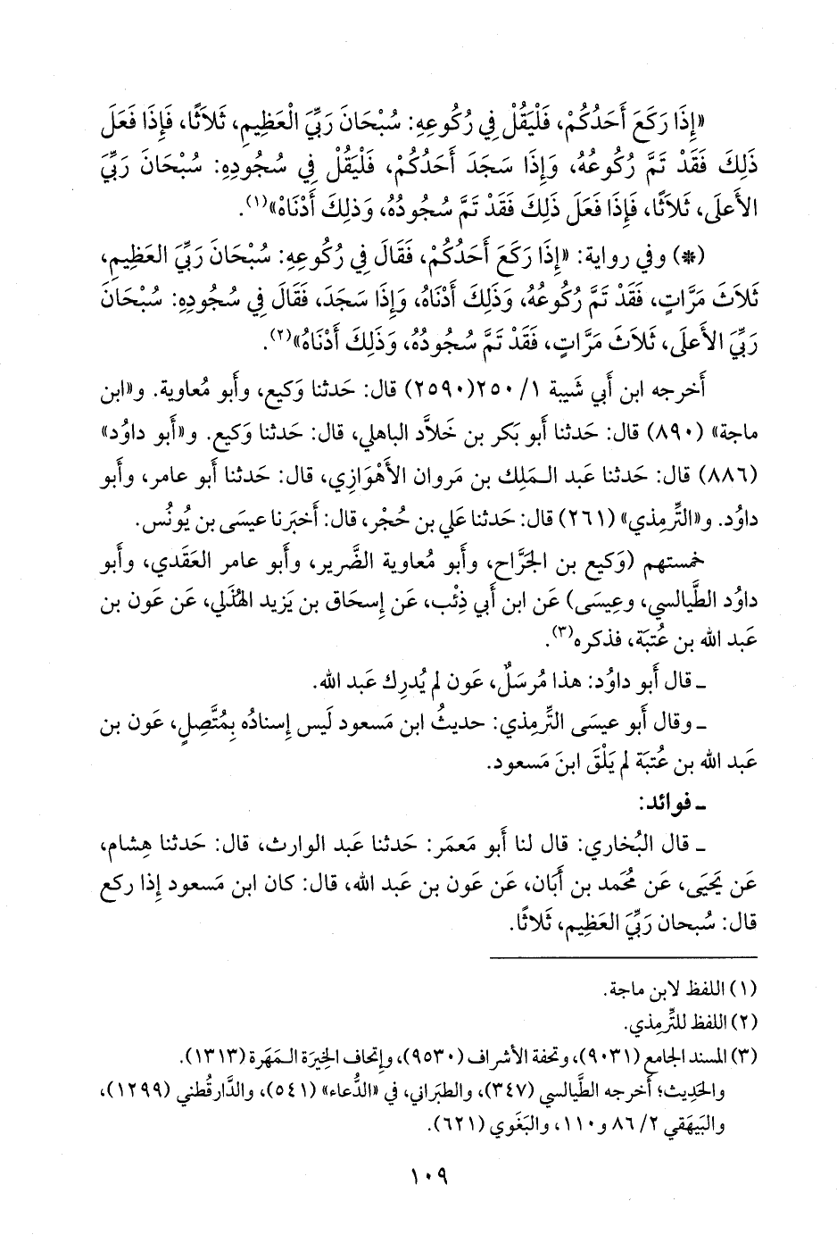 - قلنا: إِسناده ضعيفٌ؛ قال البخاري: قال لنا أَبو مَعمَر: حدثنا عبد الوارث، قال: حدثنا هشام، عن يحيى، عن محمد بن أبان، عن عون بن عبد الله، قال: كان ابن مسعود إذا ركع قال: سبحان ربي العظيم، ثلاثا.