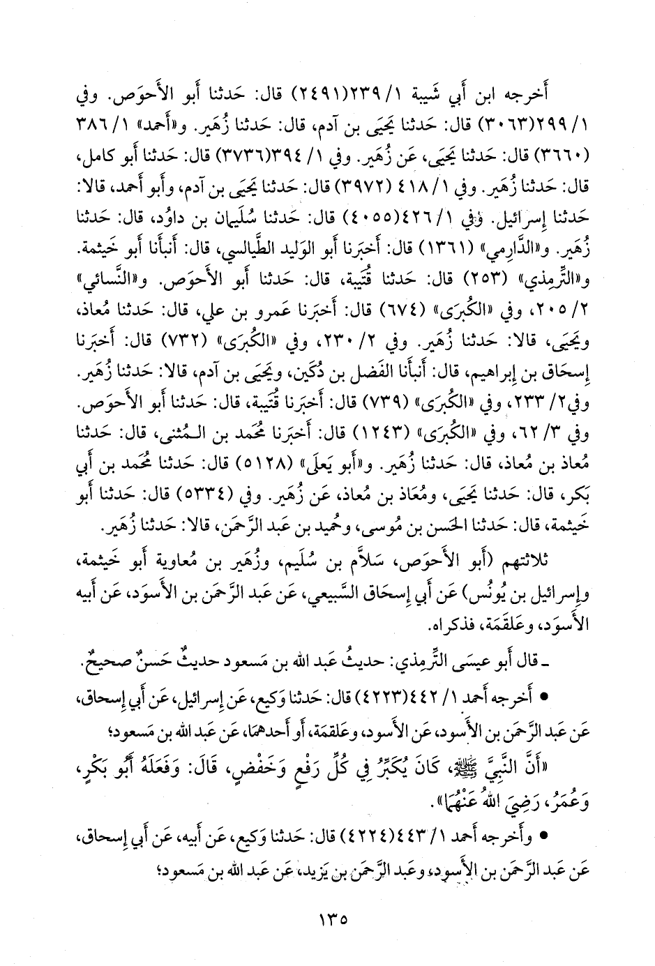 وفي ١/ ٤١٨ (٣٩٧٢) قال: حدثنا يحيى بن آدم، وأَبو أحمد، قالا: حدثنا إسرائيل. وفي ١/ ٤٢٦ (٤٠٥٥) قال: حدثنا سليمان بن داود، قال: حدثنا زهير. و «الدَّارِمي» (١٣٦١) قال: أخبرنا أَبو الوليد الطيالسي، قال: أنبأنا أَبو خيثمة. و «التِّرمِذي» (٢٥٣) قال: حدثنا قتيبة، قال: حدثنا أَبو الأحوص. و «النَّسَائي» ٢/ ٢٠٥، وفي «الكبرى» (٦٧٤) قال: أخبرنا عَمرو بن علي، قال: حدثنا معاذ، ويحيى، قالا: حدثنا زهير. وفي ٢/ ٢٣٠، وفي «الكبرى» (٧٣٢) قال: أخبرنا إسحاق بن إبراهيم، قال: أنبأنا الفضل بن دُكَين، ويحيى بن آدم، قالا: حدثنا زهير. وفي ٢/ ٢٣٣، وفي «الكبرى» (٧٣٩) قال: أخبرنا قتيبة، قال: حدثنا أَبو الأحوص. وفي ٣/ ٦٢، وفي «الكبرى» (١٢٤٣) قال: أخبرنا محمد بن المثنى، قال: حدثنا معاذ بن معاذ، قال: حدثنا زهير. و «أَبو يَعلى» (٥١٢٨) قال: حدثنا محمد بن أَبي بكر، قال: حدثنا يحيى، ومعاذ بن معاذ، عن زهير. وفي (٥٣٣٤) قال: حدثنا أَبو خيثمة، قال: حدثنا الحسن بن موسى، وحميد بن عبد الرَّحمَن، قالا: حدثنا زهير.