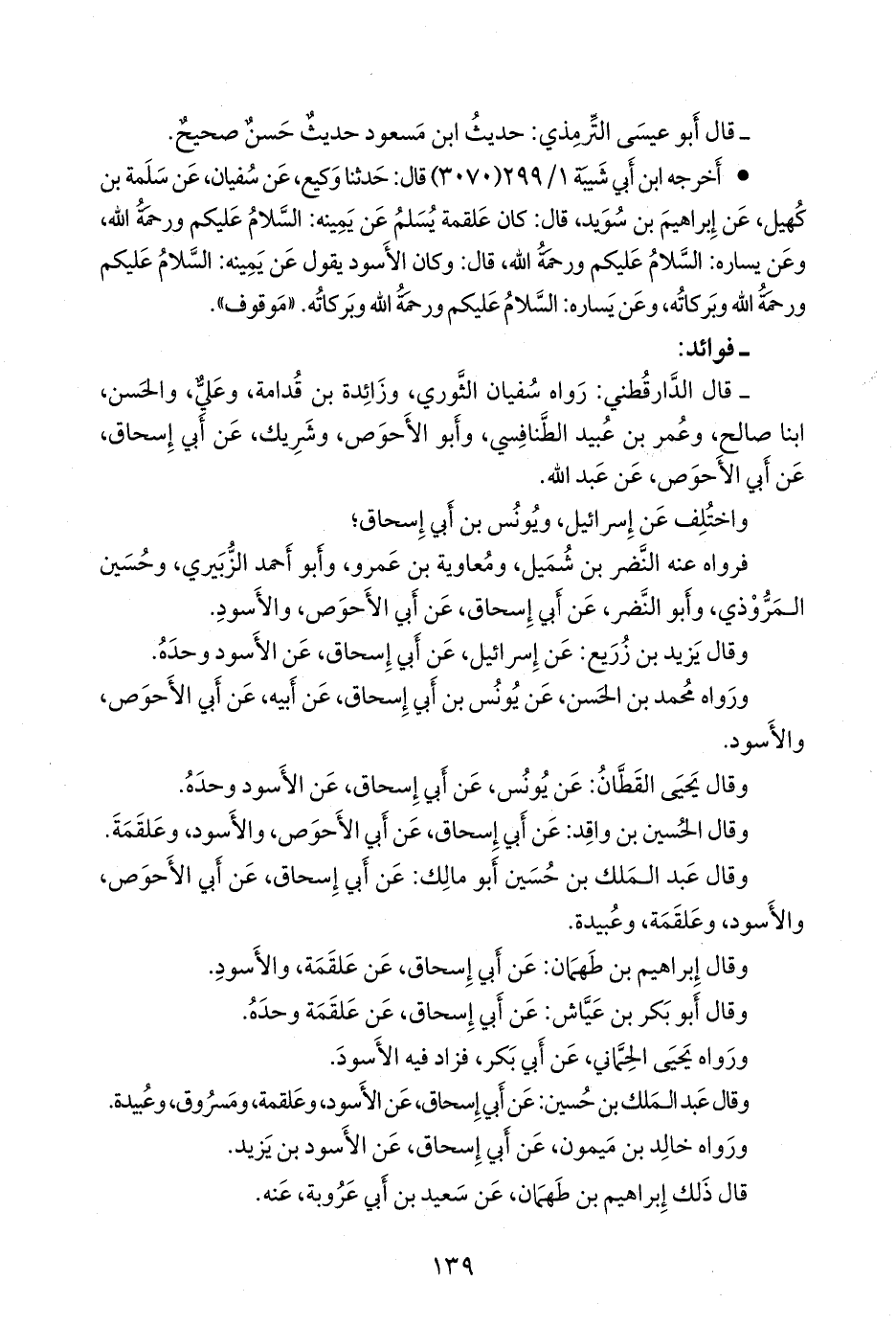 - قال الدارقُطني: رواه سفيان الثوري، وزائدة بن قُدَامة، وعلي، والحسن، ابنا صالح، وعمر بن عُبيد الطنافسي، وأَبو الأحوص، وشريك، عن أبي إسحاق، عن أبي الأحوص، عن عبد الله.