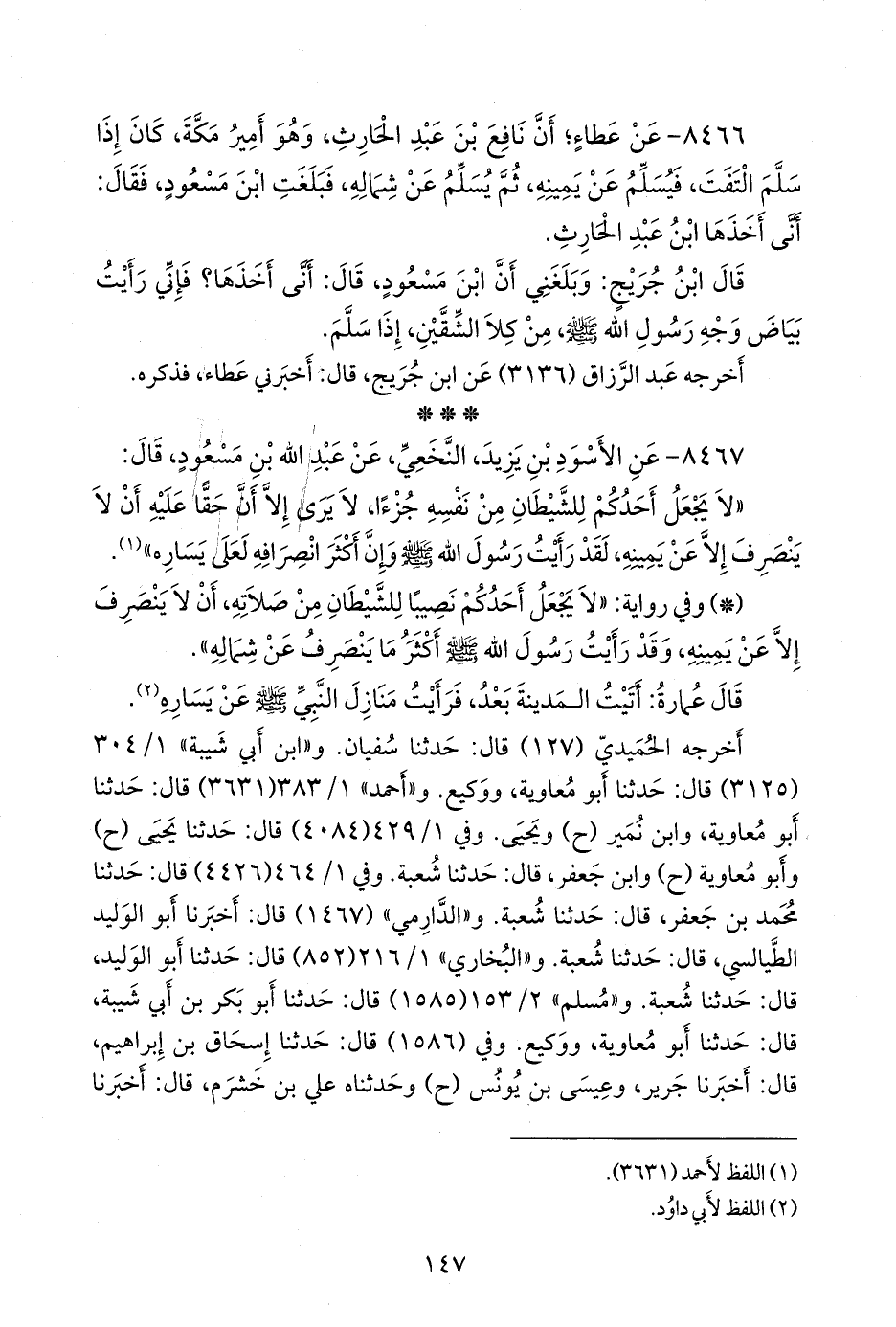 ٨٤٦٦ - عن عطاء؛ أن نافع بن عبد الحارث، وهو أمير مكة، كان إذا سلم التفت، فيسلم عن يمينه، ثم يسلم عن شماله، فبلغت ابن مسعود، فقال: أنى أخذها ابن عبد الحارث.