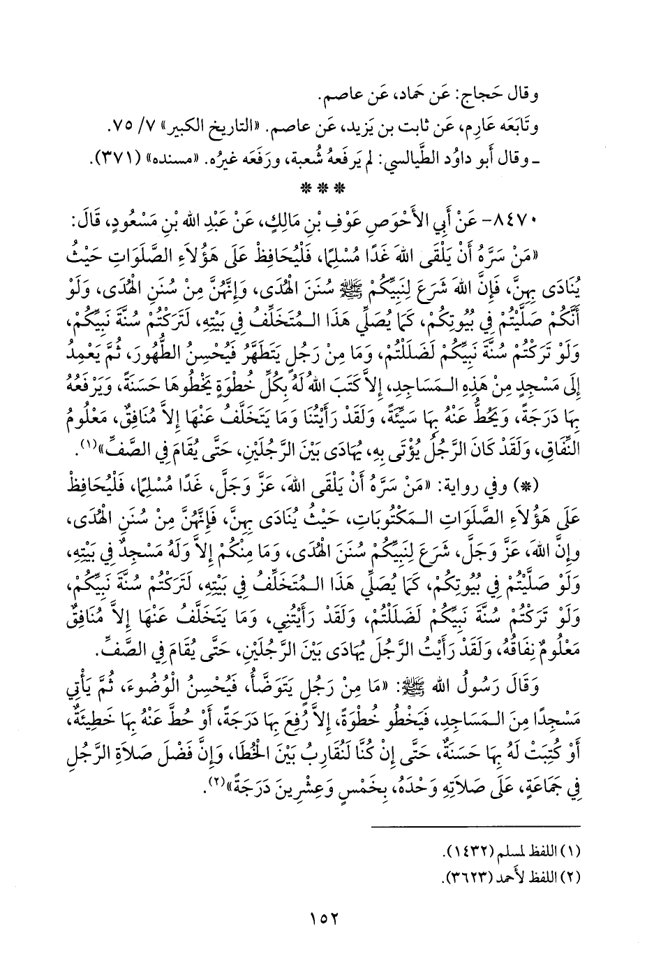 - وفي رواية: «من سره أن يلقى الله، عز وجل، غدا مسلما، فليحافظ على هؤلاء الصلوات المكتوبات، حيث ينادى بهن، فإنهن من سنن الهدى، وإن الله، عز وجل، شرع لنبيكم سنن الهدى، وما منكم إلا وله مسجد في بيته، ولو صليتم في بيوتكم، كما يصلي هذا المتخلف في بيته، لتركتم سنة نبيكم، ولو تركتم سنة نبيكم لضللتم، ولقد رأيتني، وما يتخلف عنها إلا منافق معلوم نفاقه، ولقد رأيت الرجل يهادى بين الرجلين، حتى يقام في الصف.