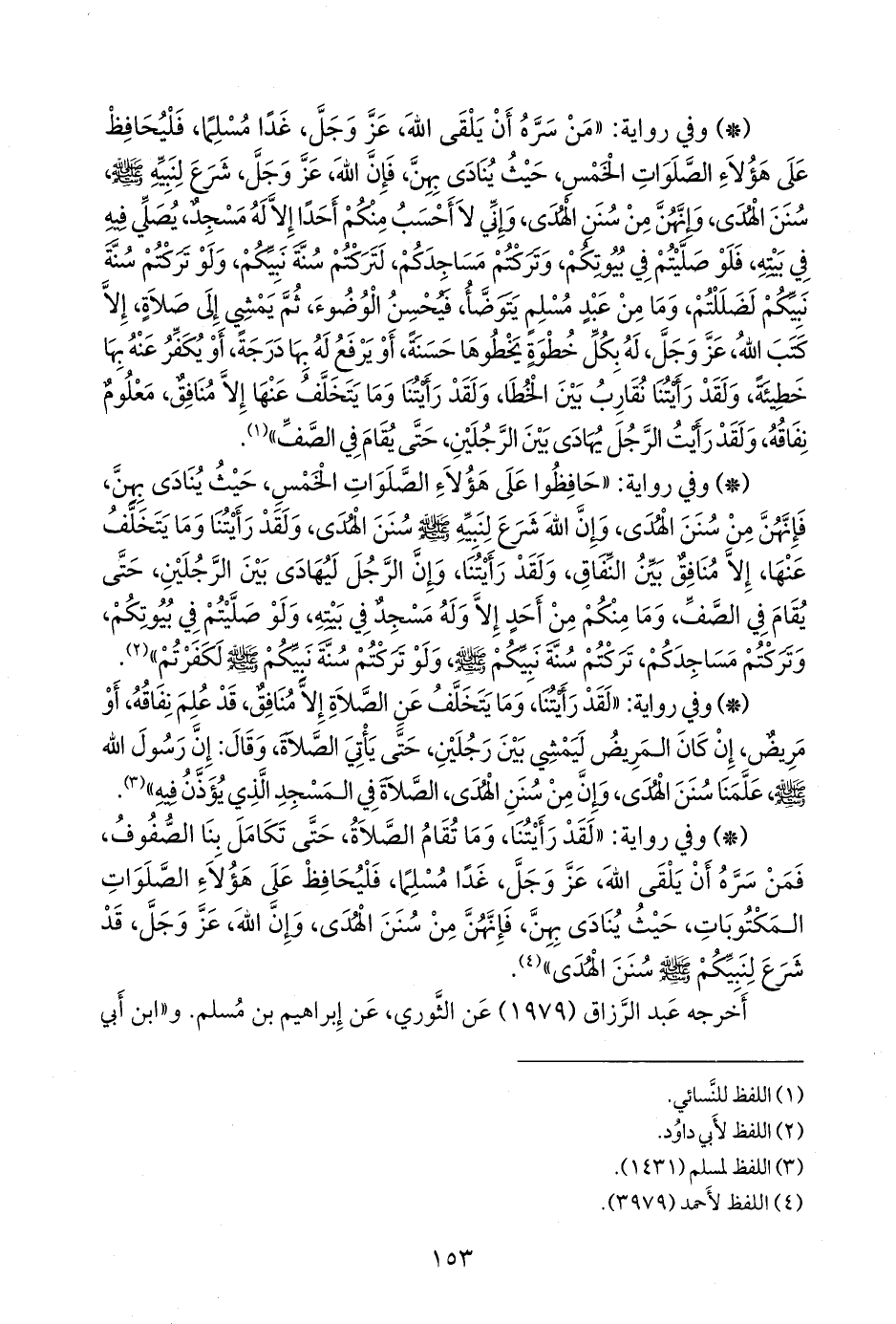 - وفي رواية: «لقد رأيتنا، وما تقام الصلاة، حتى تكامل بنا الصفوف، فمن سره أن يلقى الله، عز وجل، غدا مسلما، فليحافظ على هؤلاء الصلوات المكتوبات، حيث ينادى بهن، فإنهن من سنن الهدى، وإن الله، عز وجل، قد شرع لنبيكم صَلى الله عَليه وسَلم سنن الهدى» (¬٤).