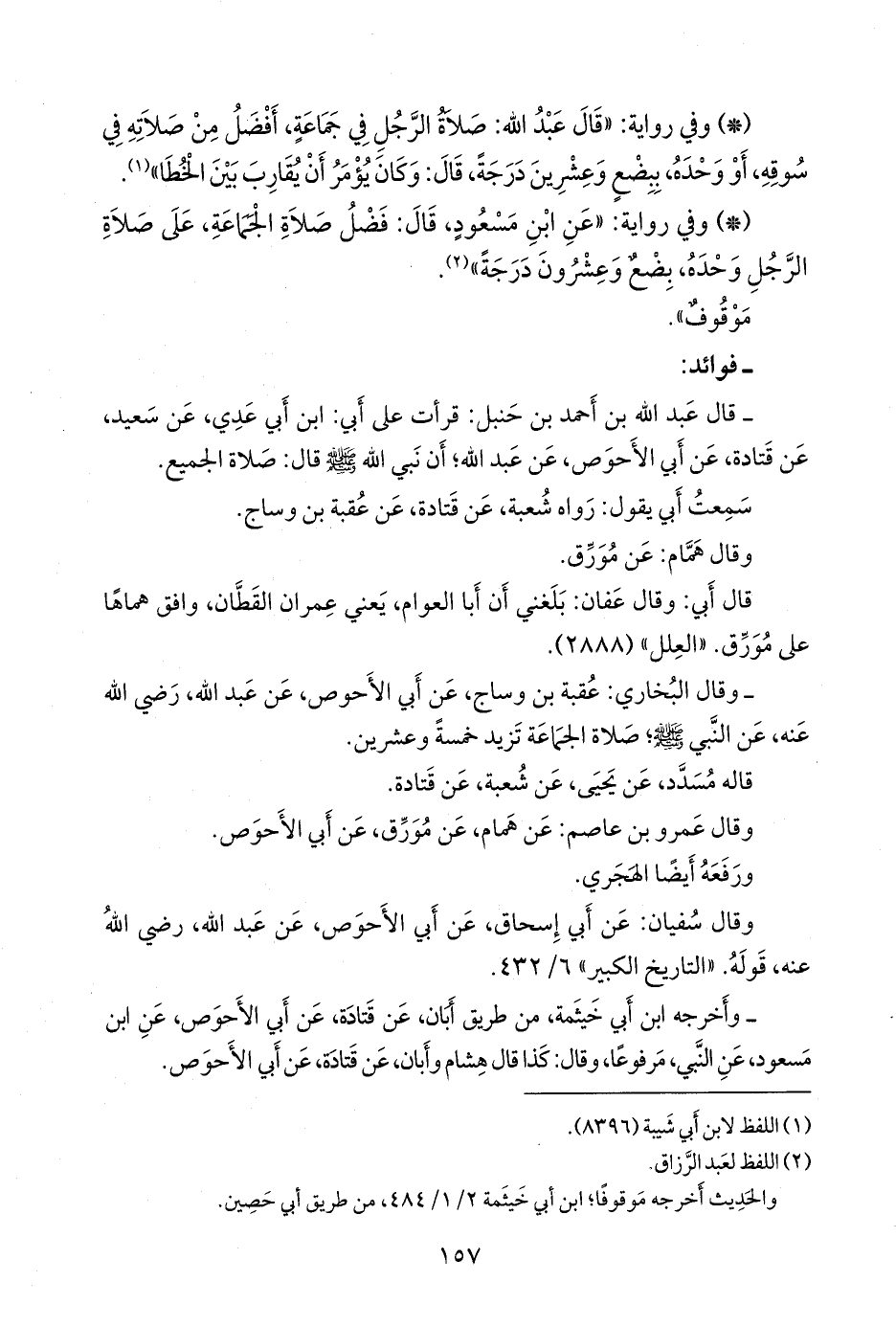 - قال عبد الله بن أحمد بن حنبل: قرأت على أبي: ابن أَبي عَدي، عن سعيد، عن قتادة، عن أبي الأحوص، عن عبد الله؛ أن نبي الله صَلى الله عَليه وسَلم قال: صلاة الجميع.