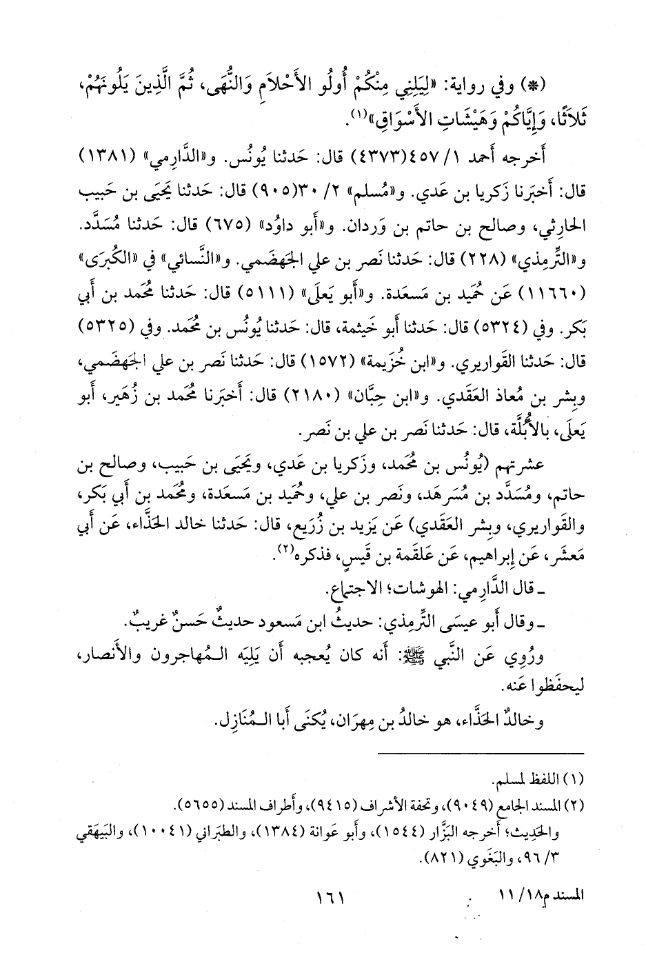 عشرتهم (يونس بن محمد، وزكريا بن عَدي، ويحيى بن حبيب، وصالح بن حاتم، ومُسَدَّد بن مسرهد، ونصر بن علي، وحميد بن مَسعَدة، ومحمد بن أَبي بكر، والقواريري، وبشر العَقَدي) عن يزيد بن زُريع، قال: حدثنا خالد الحَذَّاء، عن أبي معشر، عن إبراهيم، عن علقمة بن قيس، فذكره (¬١).