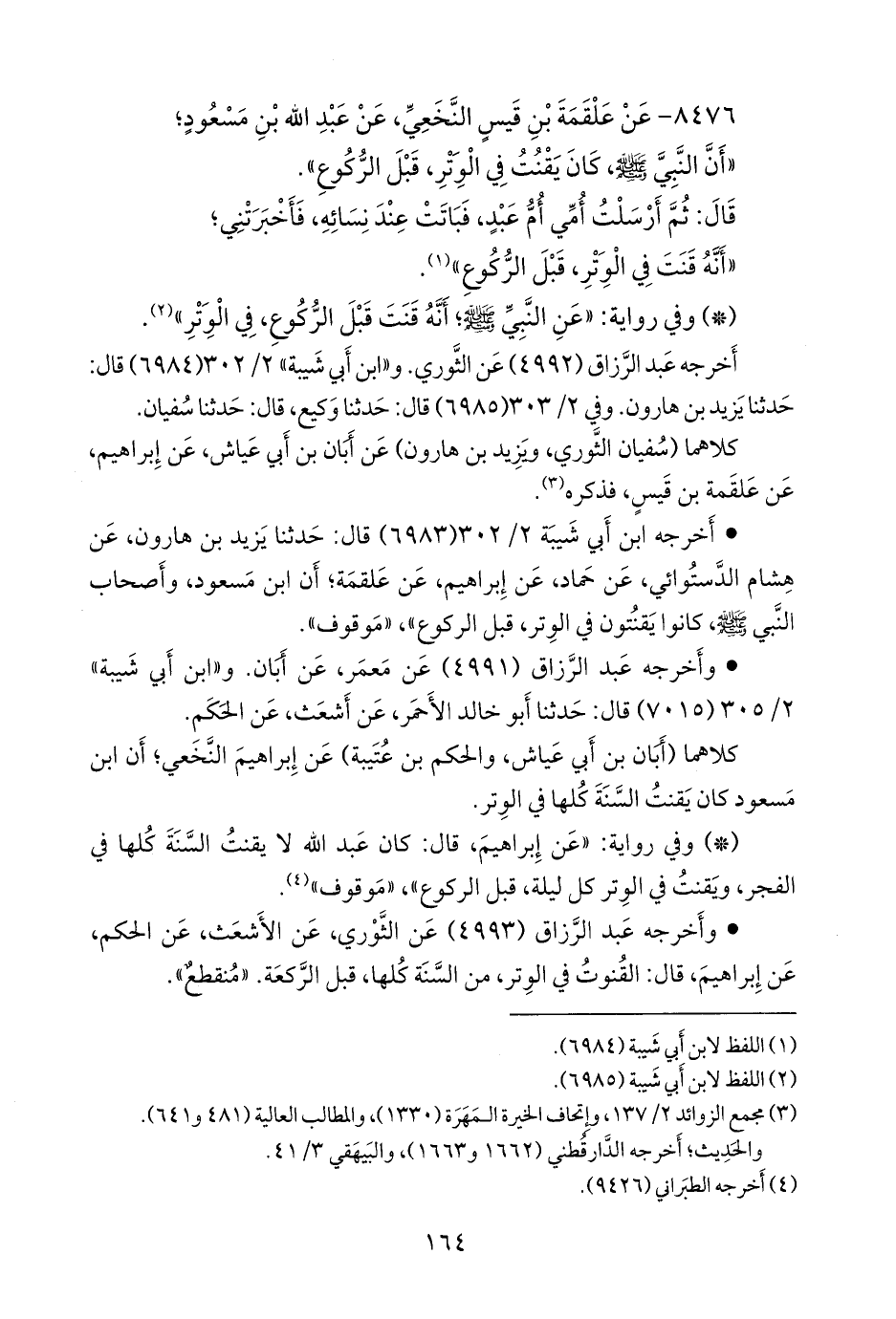 - أَخرجه ابن أبي شيبة (٦٩٨٣) قال: حدثنا يزيد بن هارون، عن هشام الدَّستوائي، عن حماد، عن إبراهيم، عن علقمة؛ أن ابن مسعود، وأصحاب النبي صَلى الله عَليه وسَلم كانوا يقنتون في الوتر، قبل الركوع»، «موقوف».