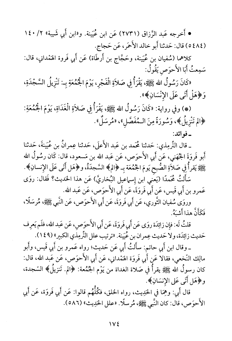 - وقال عبد الرَّحمَن بن أَبي حاتم: سألتُ أَبي عن حديثٍ؛ رواه عَمرو بن أَبي قيس، وأَبو مالك النَّخَعي، فقالا عن أَبي فَروة الهَمْداني، عن أَبي الأَحوص، عن عبد الله، قال: كان رسول الله صَلى الله عَليه وسَلم يقرأُ في صلاة الغداة من يوم الجُمُعة: {الم. تَنْزِيلُ} السجدة، و {هَلْ أَتَى عَلَى الإِنْسَانِ}.